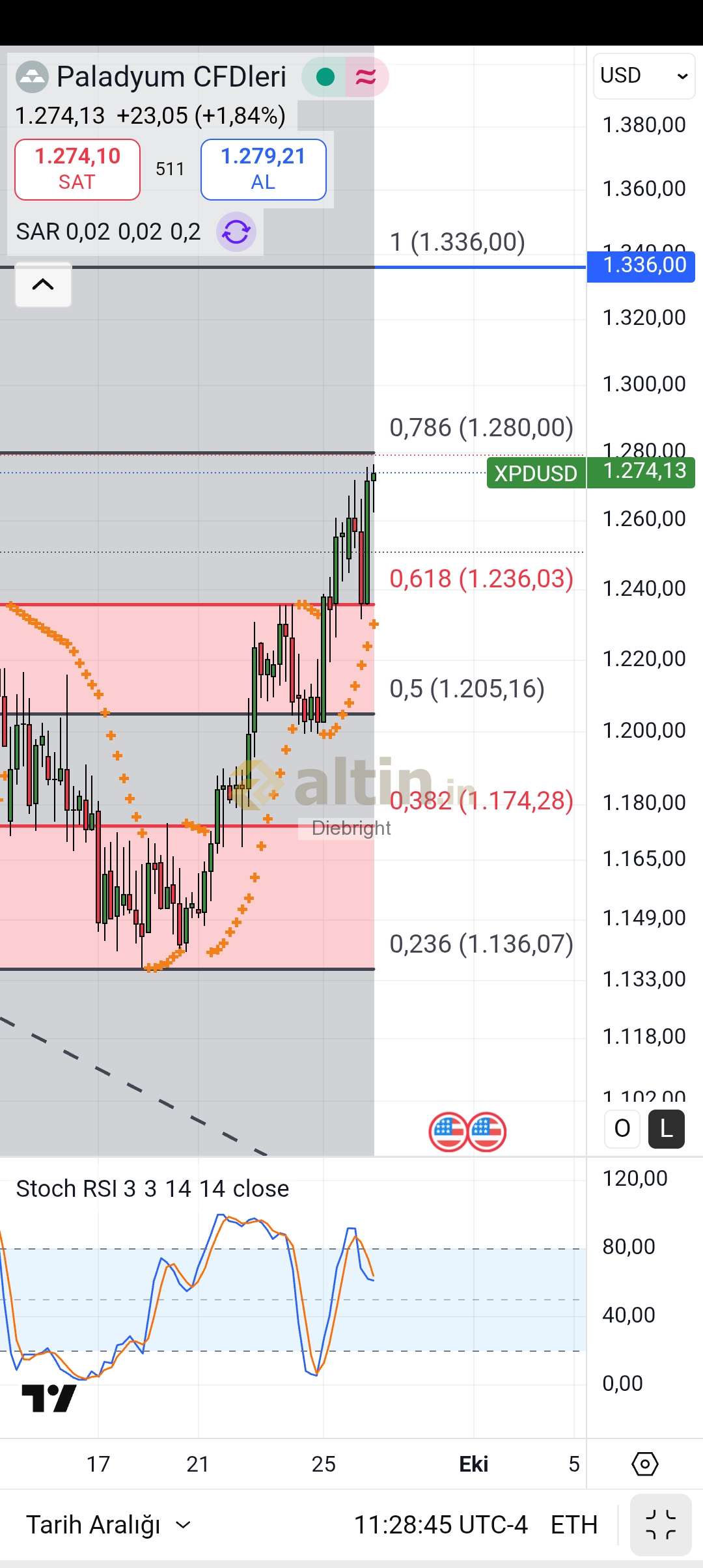 Platin için Diebright yorumu ()50.39 gibi alıp 50.81 ile sattım platini. Platin elde kalmadı. Paladyum topladım biraz. Haftaya bir ihtimal üst değerler gelir diye. Paladyum 1280 usd nin üzerine fitiller geldi ancak kalıcı olamadı. Bulunduğu yer sebebiyle 1236 usdye cekilme riski var. 30 dk sonra gün ve hafta kapanıyor. 1280 usdde kapatmayacak muhtemelen. O yüzden hafta açılışına bakacağız. Platin ise iyi kapatacak gibi.