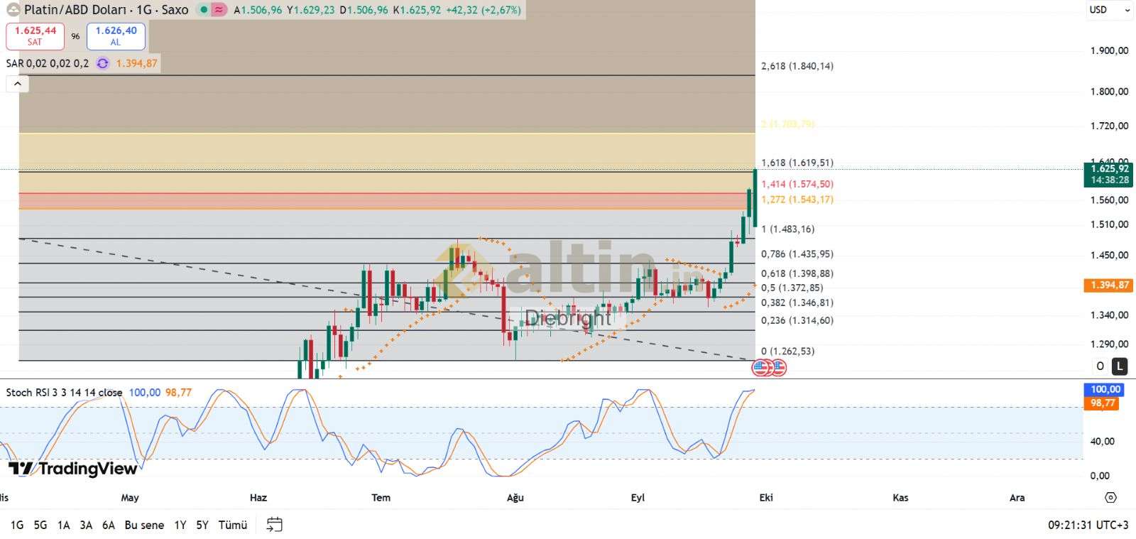 Platin için Diebright yorumu ()Platin 1574.5 kapanışı yapacak olursa haftaya 1620 dener