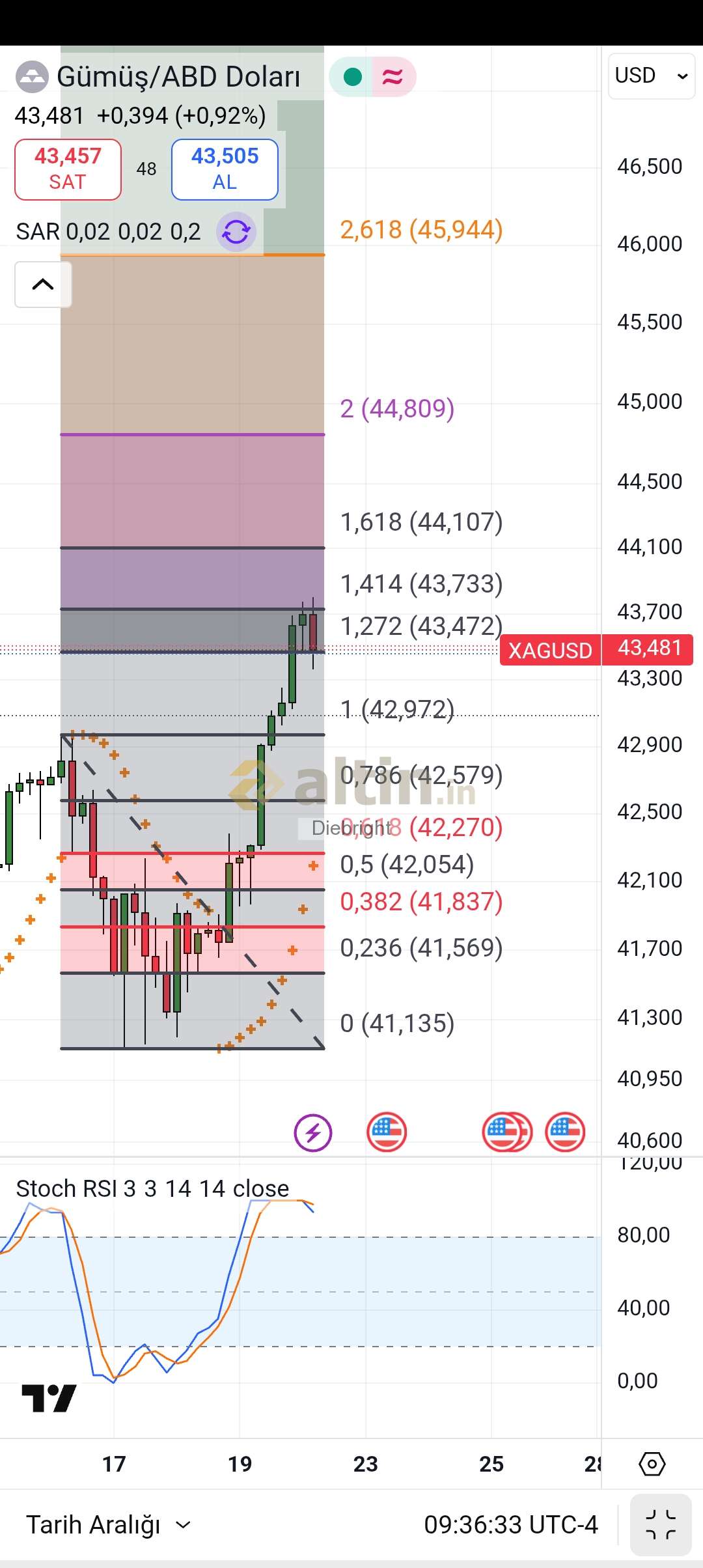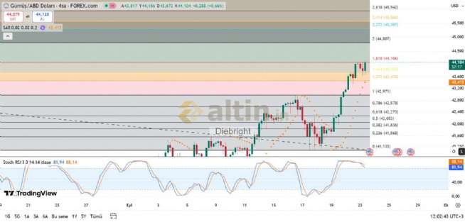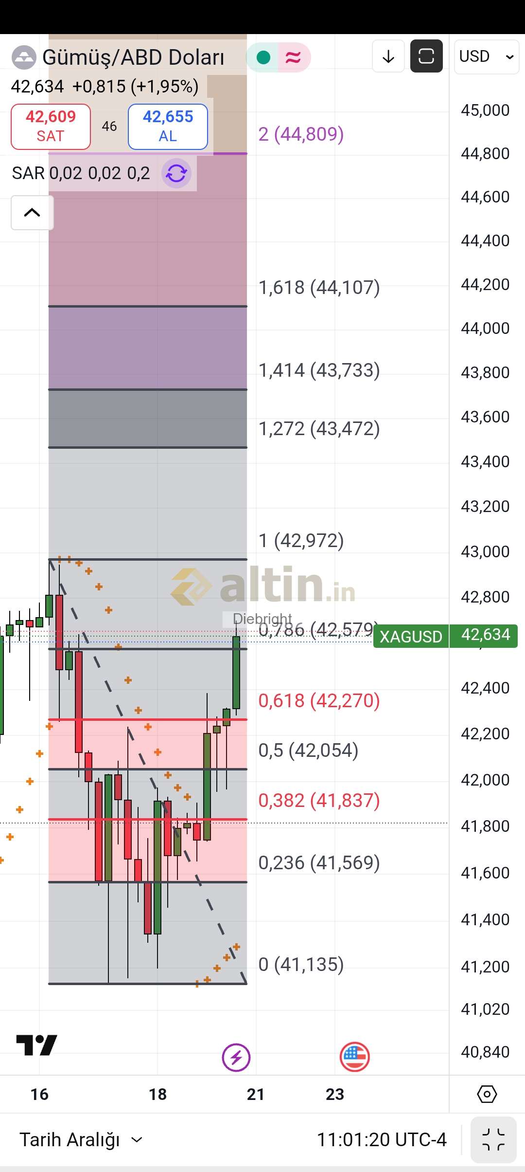 Gümüş için Diebright yorumu ()36.96 usd den aldığı destek ile az düşe kalka 44 usdye geldi. 7 usdden fazla ve %19 ons bazlı yükseliş. Gram tarafında %20 ve biraz üstünde çıktı gümüş. 44.11 usdye de az kaldı. 36.96 olduğunda iki adet sar noktası yan yana oluşuyor bu iyiye işaret dedik. Durum beni şaşırtacak kadar iyi oldu.