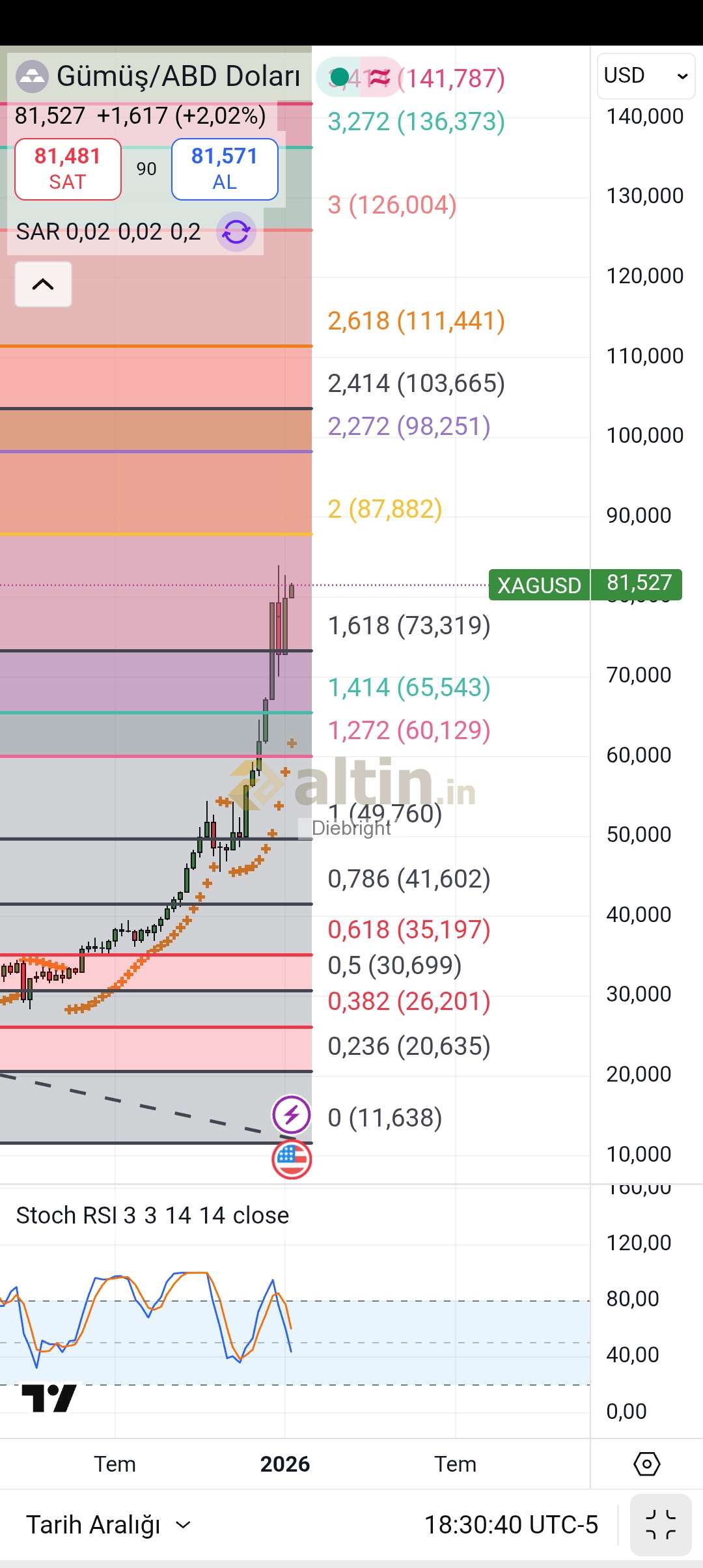 Gümüş haftalik grafik bu. Biz 70 dolar ları taban yapiyor diye beklerken esasinda Gümüş 73.32 usd fibo civarında birkaç haftadır konsolide olmaya çalışıyor. 73.32 usd üzerinde kalabildikce orta vade hedefi 87.88 usd olacak. Aylık ve üzeri göstergesi aşırılık seyrinde olsa da haftalikta hedefleri bunlar.