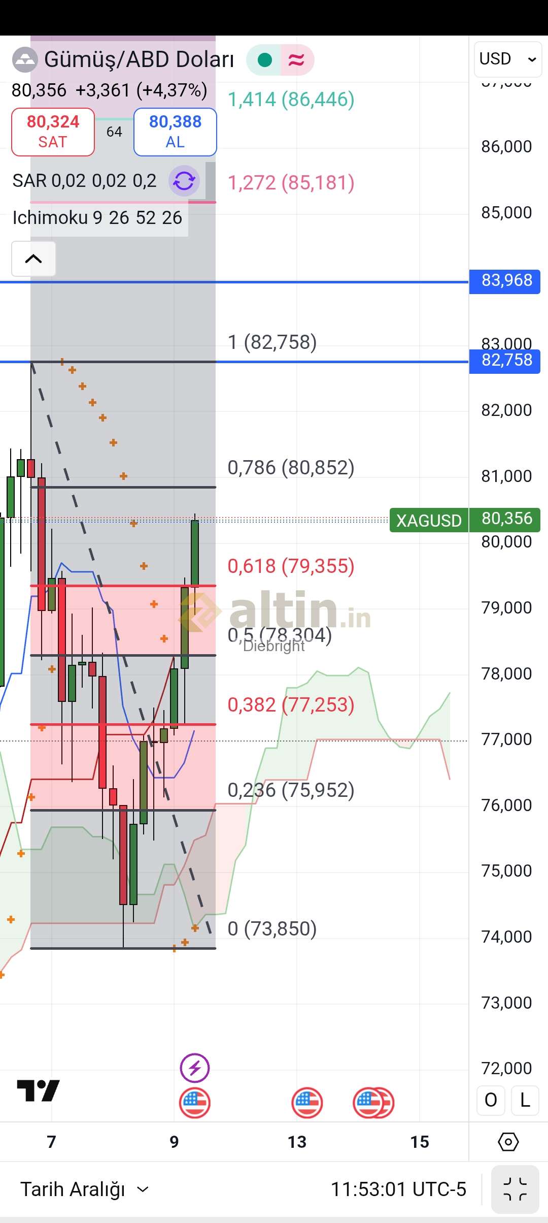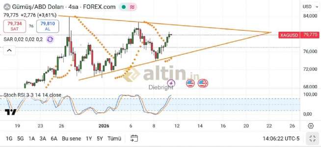 Gümüş için Diebright yorumu ()Haftalık kapanış 80 usd Altın da da 4500 usd olursa gelecek hafta da yukarı hareket devam eder. Bugünkü hacimli mum ile günlük gösterge de al bölgesine giriyor. 4 saatlik inşallah düzeltme olur da tekrar alım yaparız. Diplerin yükselmesi güzel.