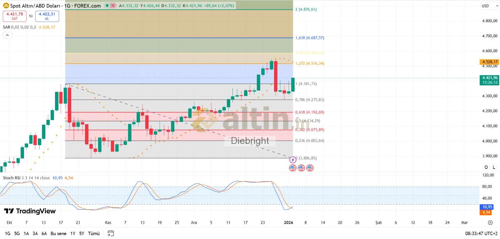Altın ons günlük gösterge kesişim başlamış. 4 saatlikte de pay var. 4276 usd den geri dönüş geldi. 4404 usd önceki tepenin de geçilmesi iyi. Durumu yine 4516 usd fibonun testinden alacağı tepki belirleyecek.