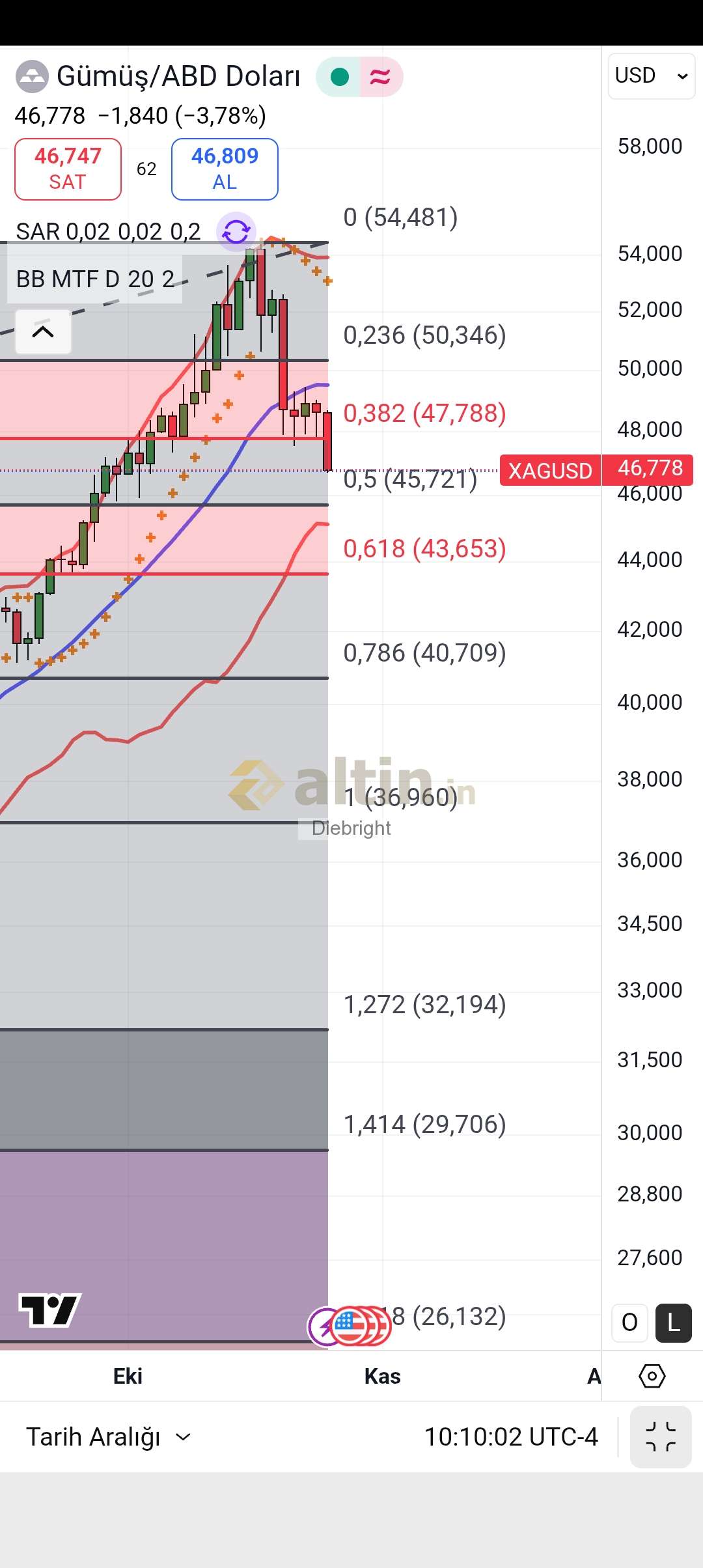 45.72 sonraki fibodur. Bolinger günlük bant dibi şu an için 45 usd civarında. Yön henüz yukarı veya aşağı değil ancak bugunku satışlarla bolinger de aşağı yöne çekilir. Alt bandına da dokunur o hatta ne kadar bilmem. Ama fırsatlar geliyor alım yapacaklar için.