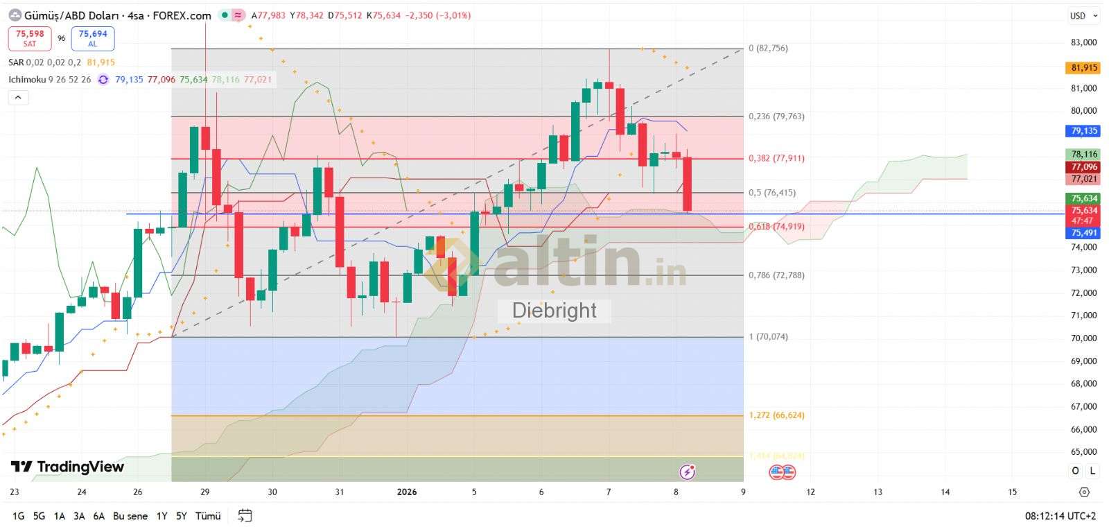 Gümüş için Diebright yorumu ()72.79 usd var bir altta fibo değeri olarak. Aynı zamanda 5 Ocak tarihinde tam da 72.79 usd değerinde açılan 4 saatlik hacimli mum ile fiyatlar 76.42 seviyesine kadar yükselmiş. Oradaki güçlü alım yerini kaybetmemeli. Yoksa yine 70 dolar lara destek almaya gider. Dönüş almak için biraz daha satış istiyor sanki piyasa.