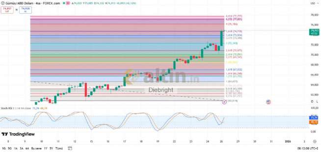 Bir tane 4 saatlik mum ile nerdeyse 3 dolar dan fazla alım gelmiş. Gümüş şaşırtmaya devam ediyor. Ufak kar satışları sonra daha güçlü yukarı. 74.718 usd üzerinde kalması demek 76.19 usdye kadar engel yok demek.