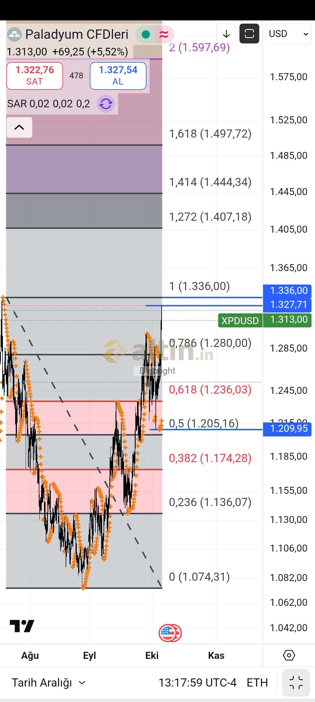 Paladyum 1336 zirvesinden 1074 usd ye geldi. Bir çanak oluşturuyor zaten bu çanak bitti bitecek. 1327 gordu bugün. 9 usd fark kaldı sadece. Çanak derinliği 262 usd. Eğer bu derinlik kadar yükselmek isterse 1598 usdye çıkar. Tabi 1336 usd kırılacak ve kademe kademe gidecek. Zaten yukarıda fibo degeri de 1597 civarina denk geliyor. Oluşursa zamanla güzel bir çalışma olduğunu göreceğiz. Piyasanın paladyumdan da 1600-1700 usdleri gormesi beklentisi var açıkçası. Asagida son dususte 1205 usdye dikkat dedik 1209.9 usd civarında destek aldı ve bugüne kadar kısa sürede 1327 usdye kadar 118 usd yükseldi. %10 çok kısa sürede gayet iyi bir oran. Konu paladyum ise tabi dikkat etmek lazım. Hareketleri sert. Şu an mesela kisada yine karar verme amaçlı bir yatay duruma geçti. 1300 usdye yapip 1209.9 usdye düştü yakın zamanda. Oradan 1327 usdye çıktı. Yani %6-7 değer kaybedip oyalayıp sonra %10 değer kazandı. Sağlam psikoloji lazım bu hareketleri takip ederken