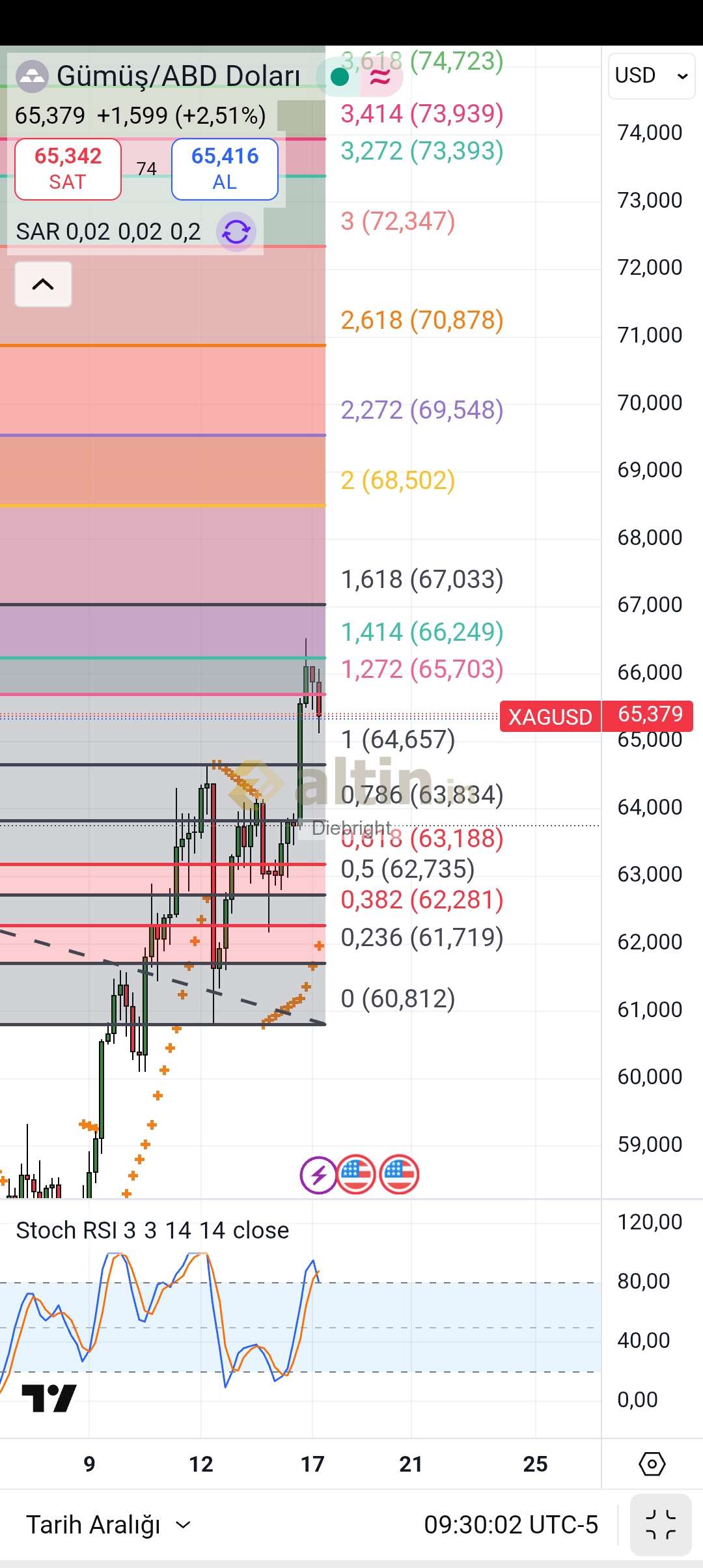 Gümüş için Diebright yorumu ()4 saatlik gösterge tepelerde o yüzden biraz momentum kesildi. 91.27 tekrar geldi. Kalanı da satsam şimdi gram artardi. Bekleyelim bakalım belki de buradan tekrar bir yukarı yapar. Açıkçası 66.25 usd değerinde kalabilmesi 67.03 hedefini canlı tutacak. Asagida sabah doğru sert alım gelen 65.5 ve dün dokunduğu 65.12 alan kişiler için stop yerleri olur düşüş gelirse.