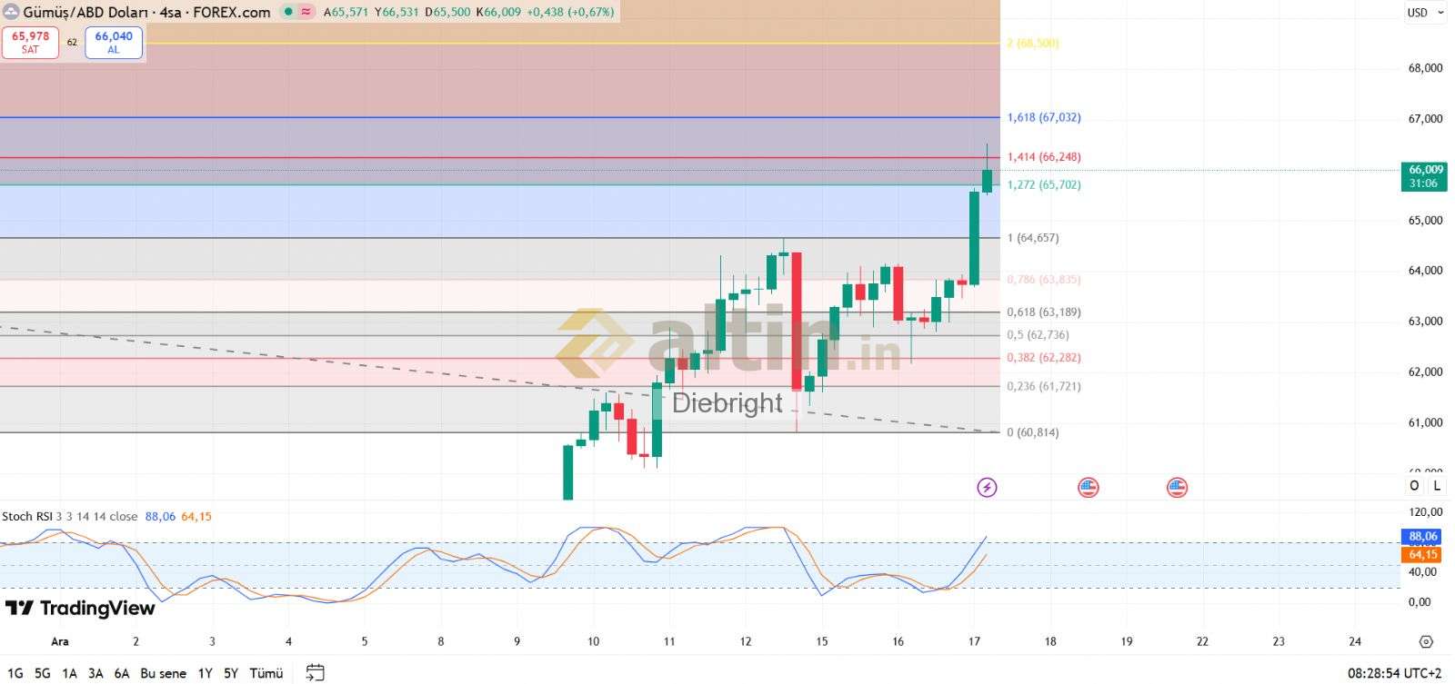 Gümüş için Diebright yorumu ()65.702 usd nin aşağısına gelirse henüz alamamış olanlar için önceki zirve olan 64.657 usdden alma şansı oluşur. Hatta keşke aşağıda hacimli geçtiği 63.84 direnci gelse.