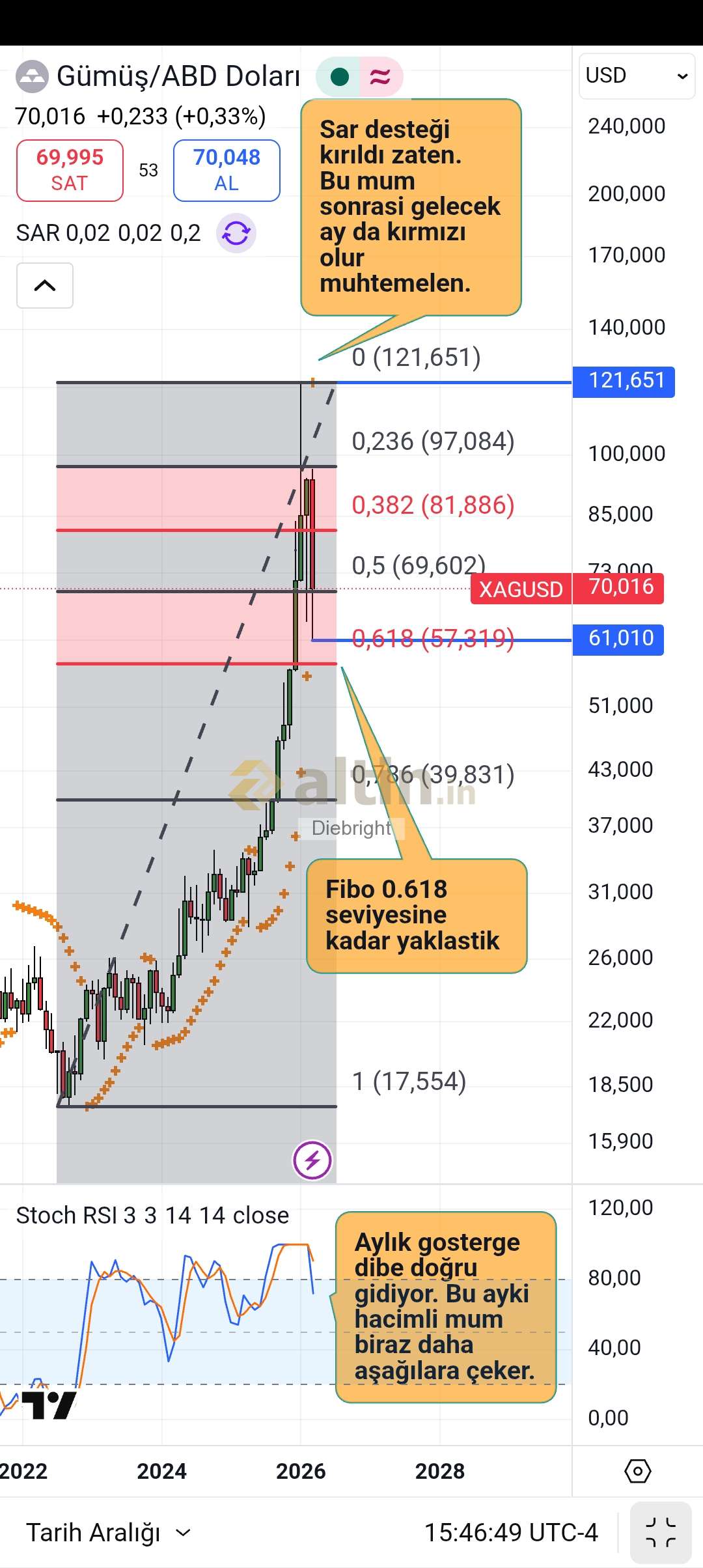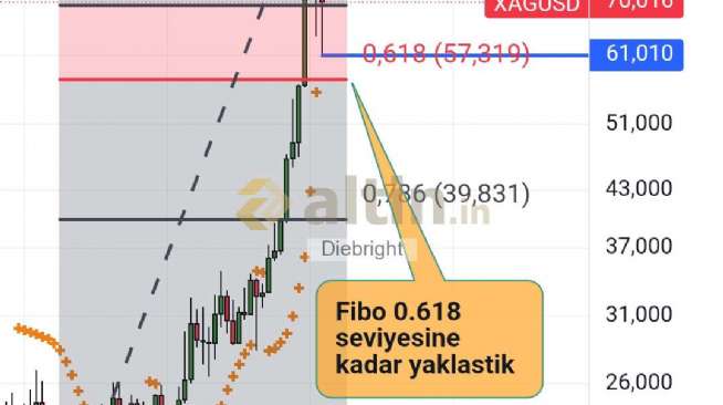 Gümüş yükseliş hareketine 17.55 usd dibiyle basladi 121.651 usd gordu. Olursa 40 usdnin aşağısına gitse zaten gümüş bitmiş demektir. 121.65-17.55 hareketinin yarısı kadar düzeltme 69.6 usd idi yaptı. Makul bir düzeltmedir. Bir altta 57.32 usd var. Oraya da zaten 3.7 dolar yaklaştı. Belki iğne atarak az aşağısına gider. Fakat kalıcı olup 40 dolarlara kadar giderse dediğim gibi gumusun işi uzun sure bitmiştir zaten. Şu an Aylık düzeltme devam ediyor. Ben 40 dolarli seviyeleri bile zor görüyorum yakin zamanda. Bakalım artık.