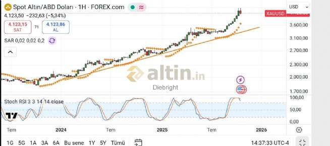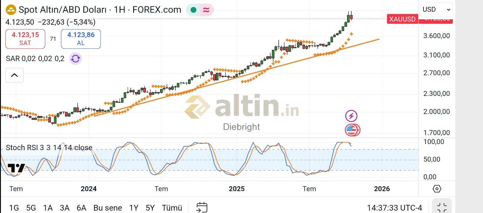 Günler hatta haftalar sonra sar destegi günlükte kırıldı. Gunluk gösterge dibe doğru gidiyor henüz dip yapmadı. Yaparsa iyi olur. Yeni yükseliş için hazırlanır. 4129 usd fibo aşağısında kalırsa alt hedefler 4000 psikolojik seviye ve 3973 usd ise sonraki fibo hedefi olur. Kademe kademe takip ederiz. Büyük düzeltmenin artık sinyali geldi. 4129 usdnin aşağısına geldiği için.