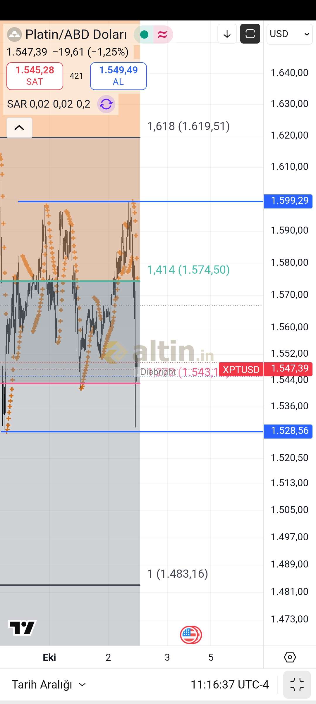 Platin de yani 1600 usd direnç dedik hatta 1600-1630 aralığı. 1599.29 ile bir satış gelmiş. Onceki dip olan 1528 usdye çok yaklaştı. 1543 usd üzerine bir miktar çıktı. Şimdi 1543 kalıcı olmali yoksa düşer.