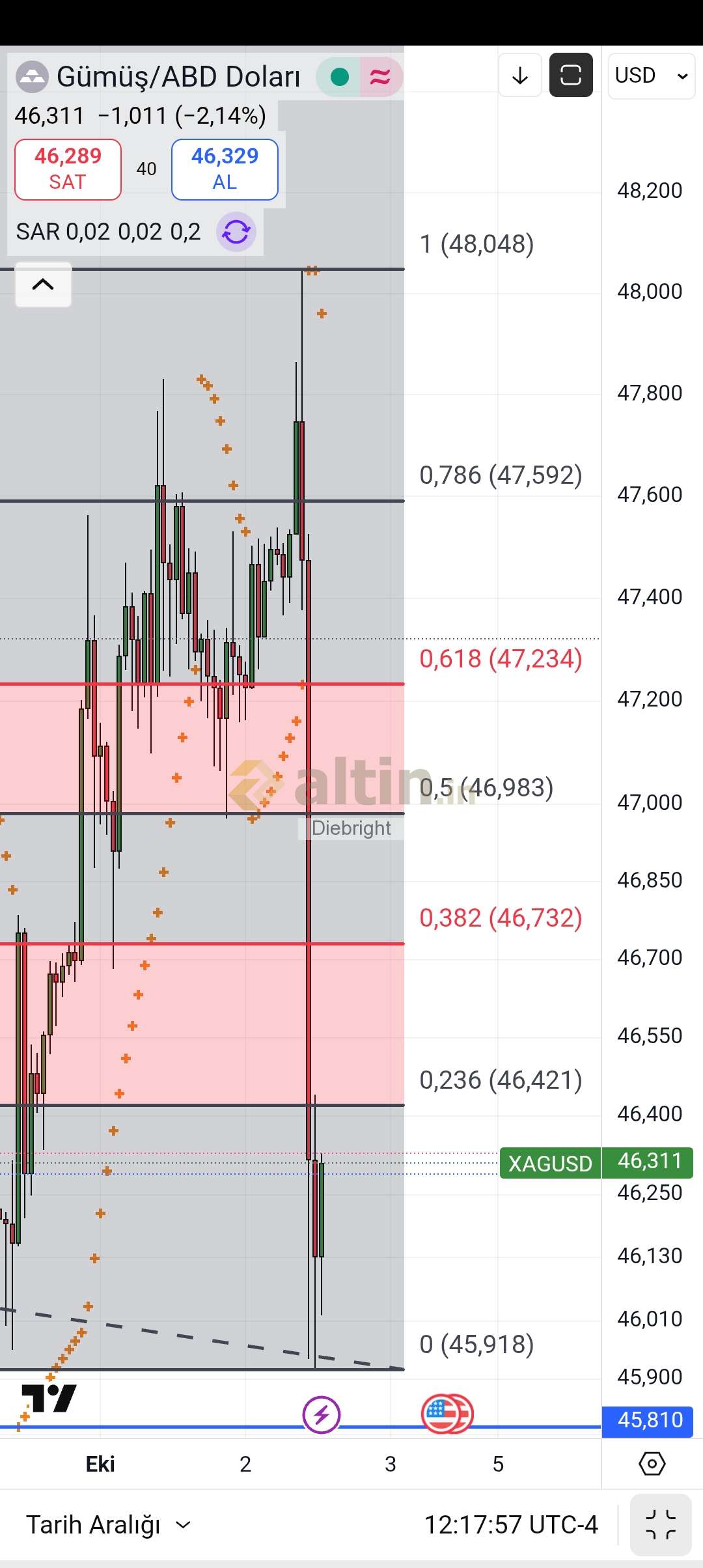 Gümüş için Diebright yorumu ()45.94 usd ye yakın bir mola verdi. Kuvvetli bir dönüş ve toparlanma gerçekleşmesi lazım. Aksi halde 45.25 usd.