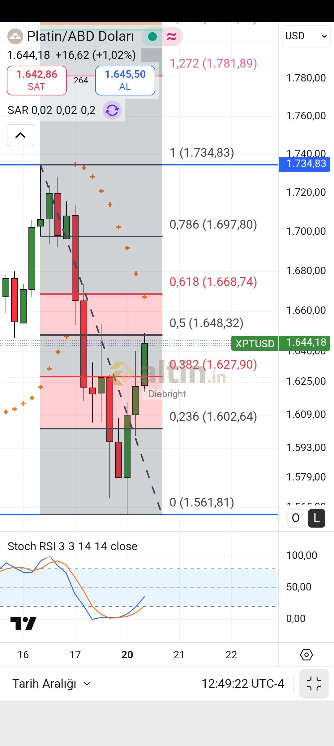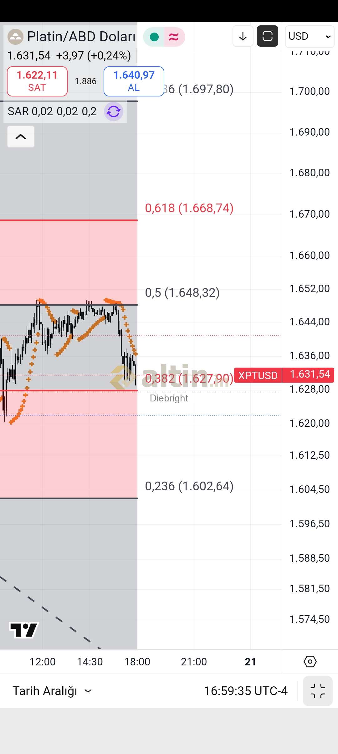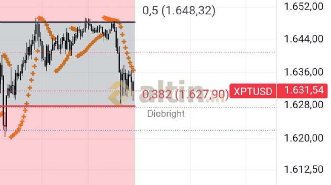 Platin 5 dklik grafige indirgedim. Fibo direnç 1648 usd çok iyi çalışıyor. Bir aalt destek de aynı şekilde iyi çalışıyor. Kaybın yarisini verdi geri çekildi.