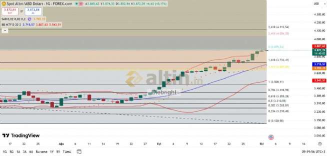 Üst bant sınırında devam ediyor. 3900 psikolojik direnç. Bant 3888 usd civarından geçiyor tabi değişkendir. 3900-4000 piyasanın psikolojik seviyeler olarak gördüğü yerler. 4036 fibo ara hedef. 4113 usd fibo Altın oran hedefi.
