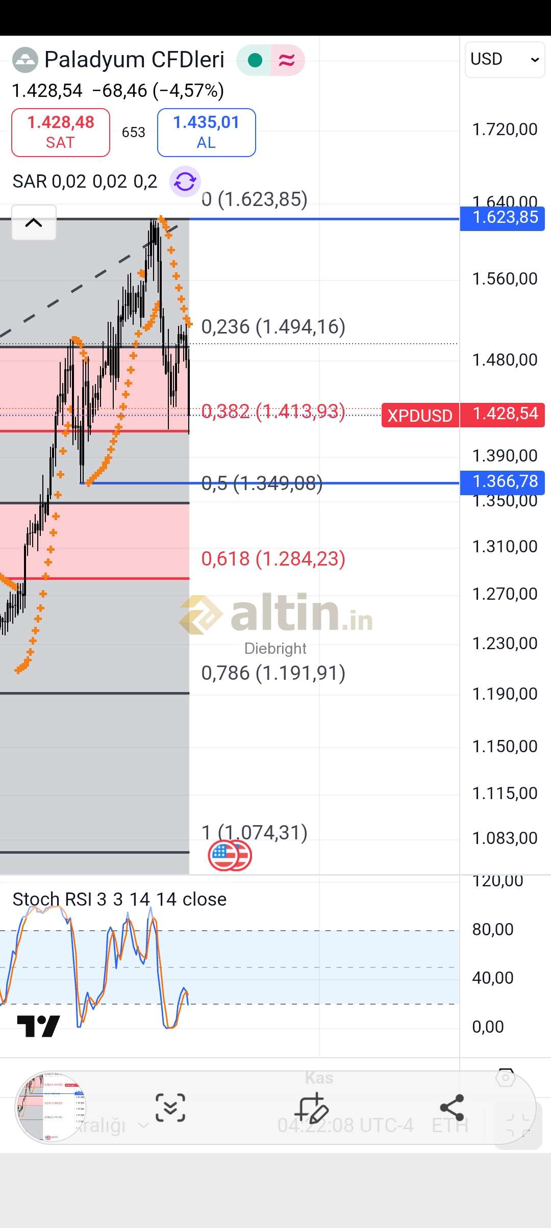 Paladyum da platin gibi bir dip buldu. 4 saatlik göstergesi de dip yaptı. Ve ikisi de yukarı gitmeye başladı. Platine göre bulduğu dipten daha az geri dönüş sağladı. Platin yarisini kaybın geri verse de paladyum henüz yarısına ulaşmadı. Ulaşmadı için 1520 usd görmeli. Ulaşır muhtemelen. Az kalmış. Güzel fırsatlar verdi ikisi de. 4 saatlikleri dip yapınca çıkışa başladılar. 46.85 usd paladyum 51.22 platin almıştım. Aldıklarımı satmamis olsam kar miktarim x3 olurdu. Bakalım bu fibo 0.5 seviyeleri geçilmez ise belki geri gelirler. Fakat 4 saatlikler yükseliş için müsait onu da belirtelim.