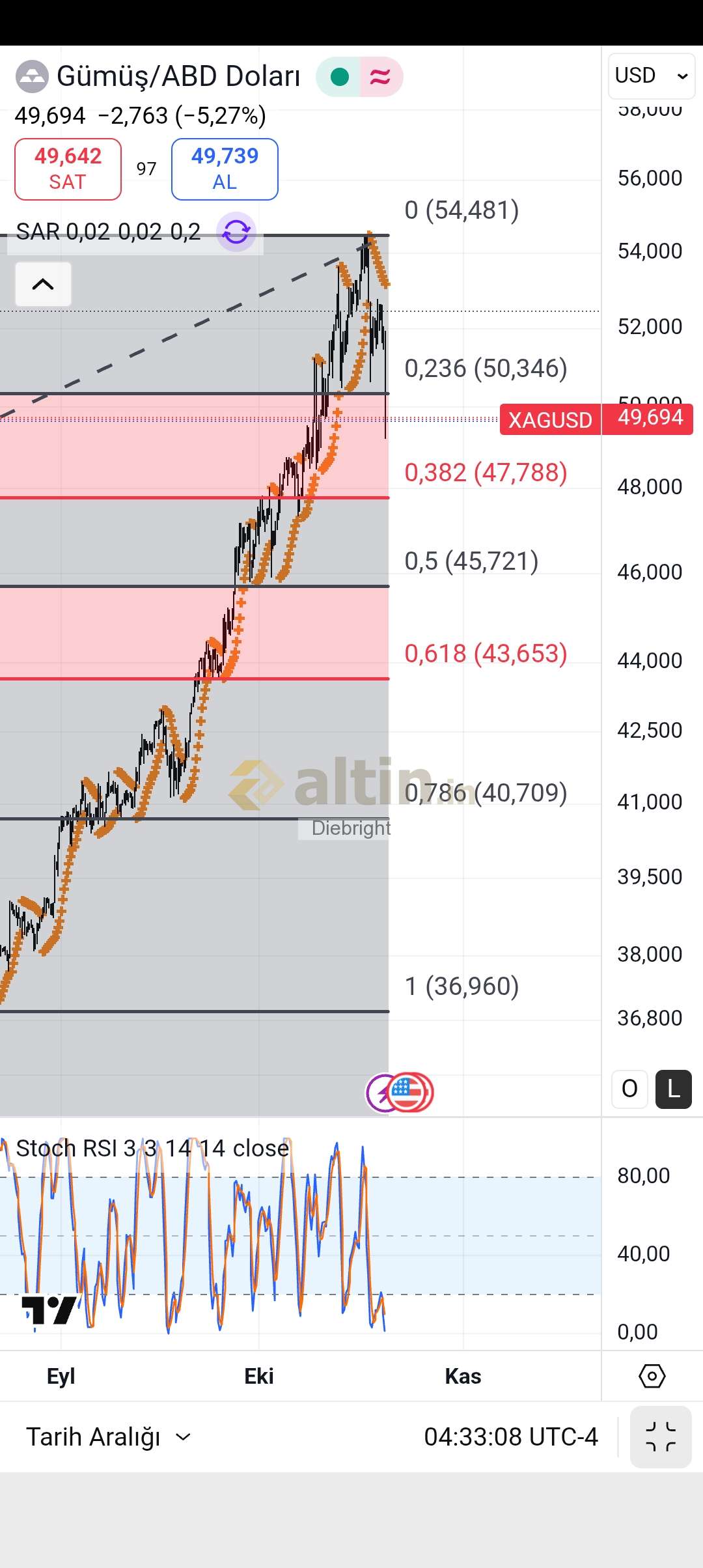 Bilmek zor. Altin ons güzel geri dönüş yaptı kayıpların çoğunu geri aldı. Aslında gümüş de platin ve paladyum gibi düşüşün yarisini geri aldı. Hemen hemen bu ikisi ile aynı bu açıdan. Altına bakarsak tabi gumusun bulunduğu yerden biraz daha yukarıda olması lazımdı. 54.481 usd den 50.625 usdye nerdeyse 3.8 usd kayip. Sonrasında gördüğü en yüksek seviye 52.77 usd. Yarısını geri alması için 52.55 usd gormeliydi. Görmüş biraz üstünü. Platin ve paladyum ile eş değer miktarda hemen hemen. Ancak altını n gerisinde. Fakat şahsen 4 saatlik göstergesi bana ileri gidebilir diyor.