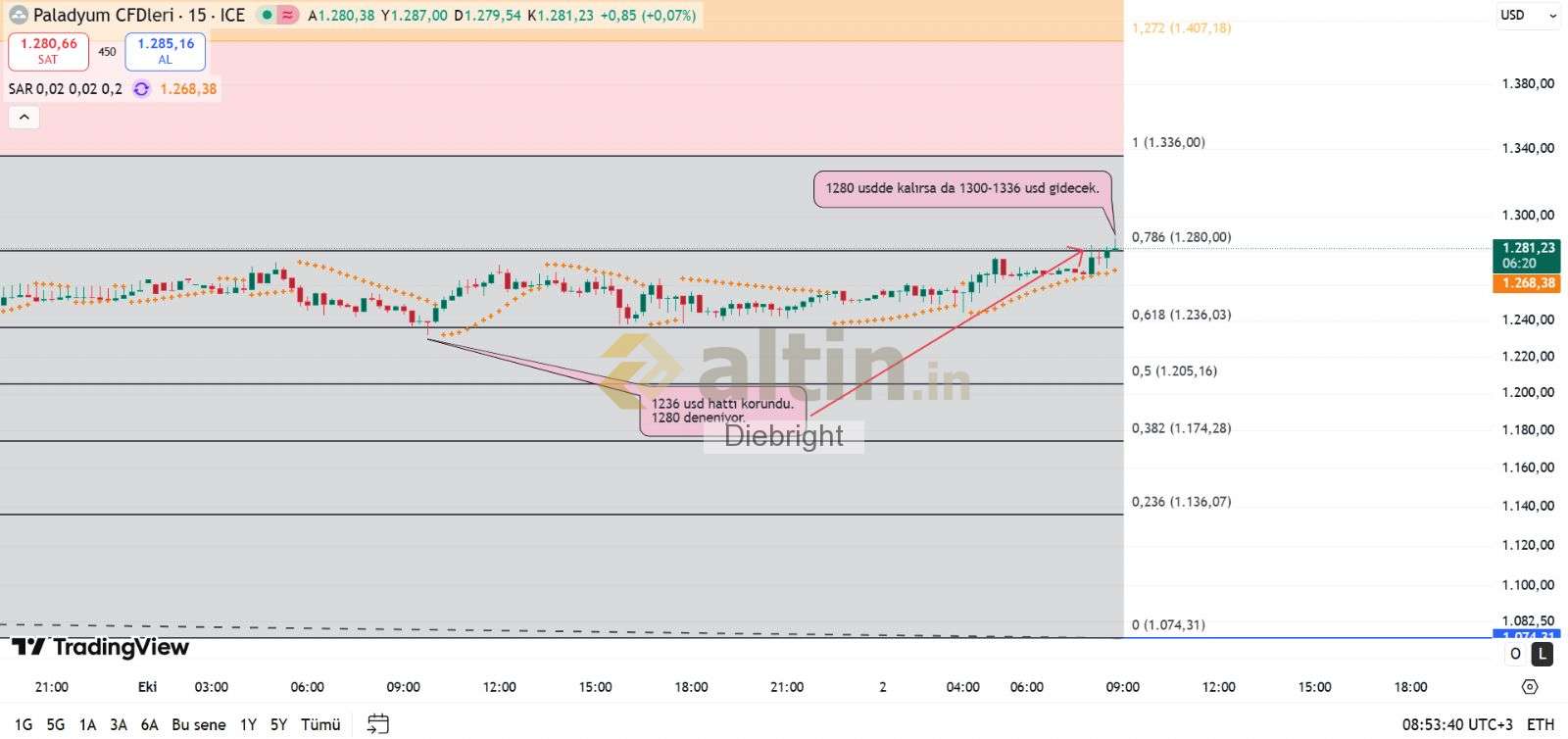 Paladyum dün dipten topladım ancak erken sattık. Dün bir 50 gr kalmıştı onu da sattım. 15 dklık grafik ile al sat yapıyorum. 1280 deneyeceğini biliyordum fakat sabredemedik buraya kadar. 1284 usd ye kadar çıkmış. Değerlerde değişme yok. 1236 korundukça 1280 usd. O da korundukça 1300 ve 1336 usd. parite bir ara 41.27 gördü. Yani 40.08 ile ful alıp beklesem 1500 usd civarı bir kazanç birkaç saatte elde edilecektir. Bir dahaki turda artık. Platin de bir miktar almıştım. 49.98-50.11 arası. Platin bu kez biraz geri kaldı. Platine ilave yaptım biraz yukarıdan da olsa. Belki 1574.5 usd dener de dünkü gibi 1598 görürüz diye. Umarım dener. Paladyumda güzel yerden alıp erken satmanın karşılığını buradan alırız belki.