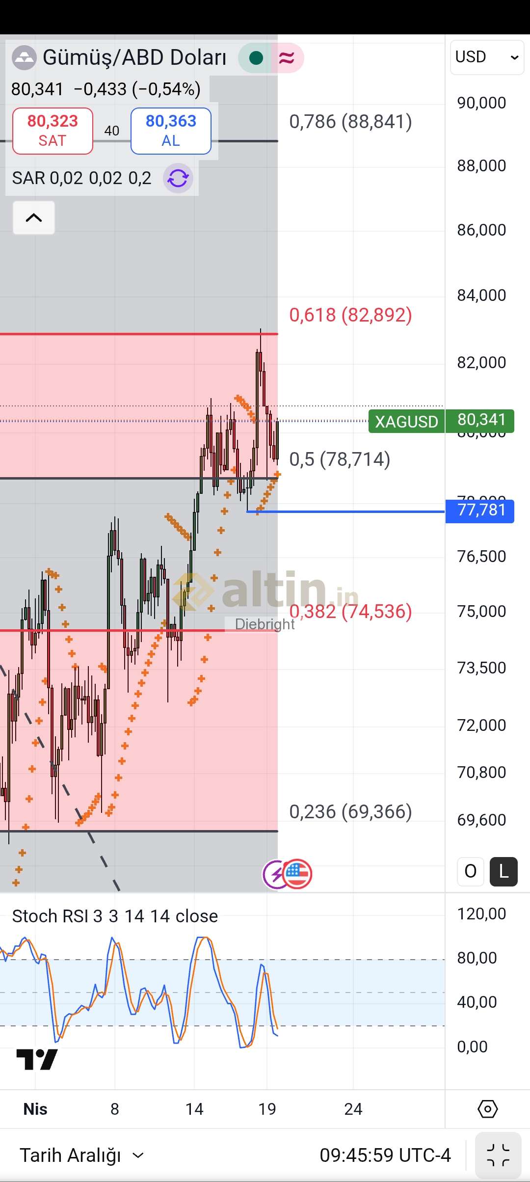 Gümüş için Diebright yorumu ()78.71 ve bir altta önceki dip 77.78 usd yi takip edelim. 4 saatlik gösterge dibe epey yakin. Ancak gunluk dip için hacimli satışlar olmadigi sürece ancak haftaya dip gelir. Ben az bir miktar alım yaptım 4 saatlik dibe yaklaştığından.