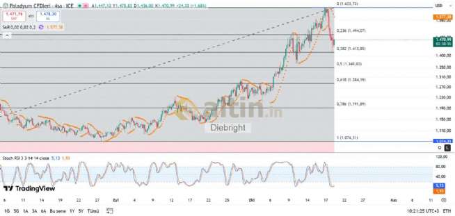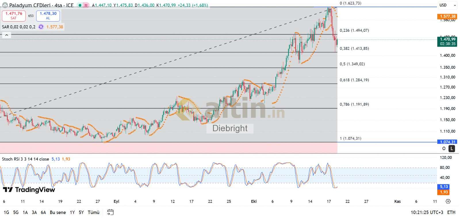 Paladyum da 1624 usd gördü. Buraya 1074 usdden geldi. Tam 1413.85 usd fiboya kadar da 2 kademe düzeltme de yaptı. Şahsen 1350-1360 usdlere kadar da geri çekilir diye bekledim. Onun da 4 saatlik dipteydi. Günlük ise platine göre dibe varmasına daha çok vardı. Tepki alıyoruz şimdilik. 1624 usdden 1414 usdeye 210 usd sert satış yedi. Toparlarsa iyi olur. En azından 1500 usd üzerine gitmeli. İkisi de al sat imkanı veriyor. Paladyum alamadık henüz. Gece güzel yerler gelmiş ikisi için de hareketlilikte yakalanmadan al sat yapabilsek iyi olacak.