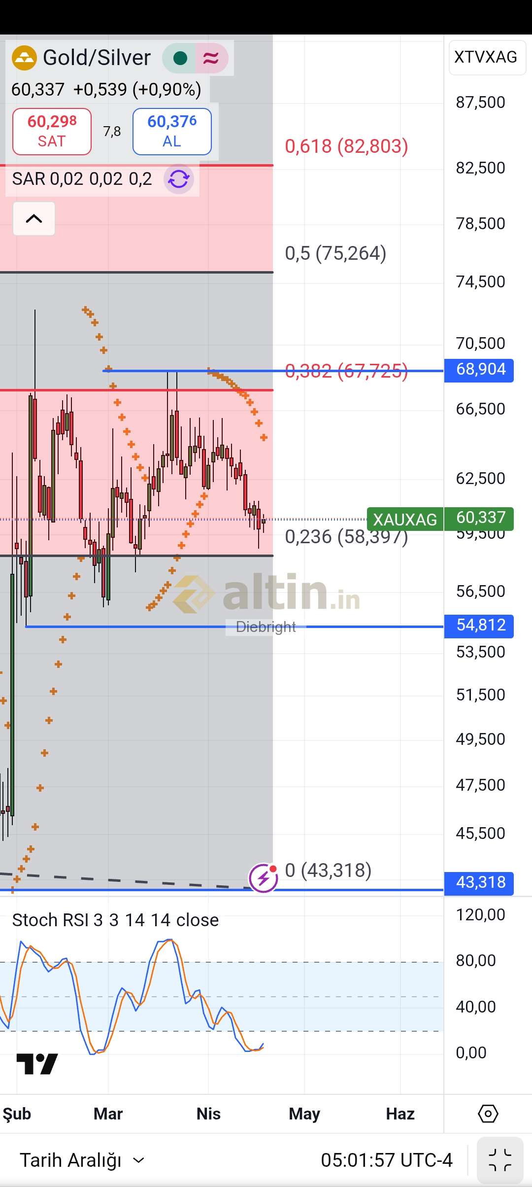 Rasyoda günlükte dipten dönüş sinyali var. Ancak şimdilik zayıf. 58.4 bekliyordum. Kırılırsa güzel şeyler olacaktı onslarda. Epey yaklamis. Hafta sonu haber akışı işi bozdu. Şu an bakalım henüz satış baskısı rasyoda devam ediyor. Ben yine de rasyodan ziyade gumusun fiyat hareketine kritik desteklerine bakmayı yeğlerim.