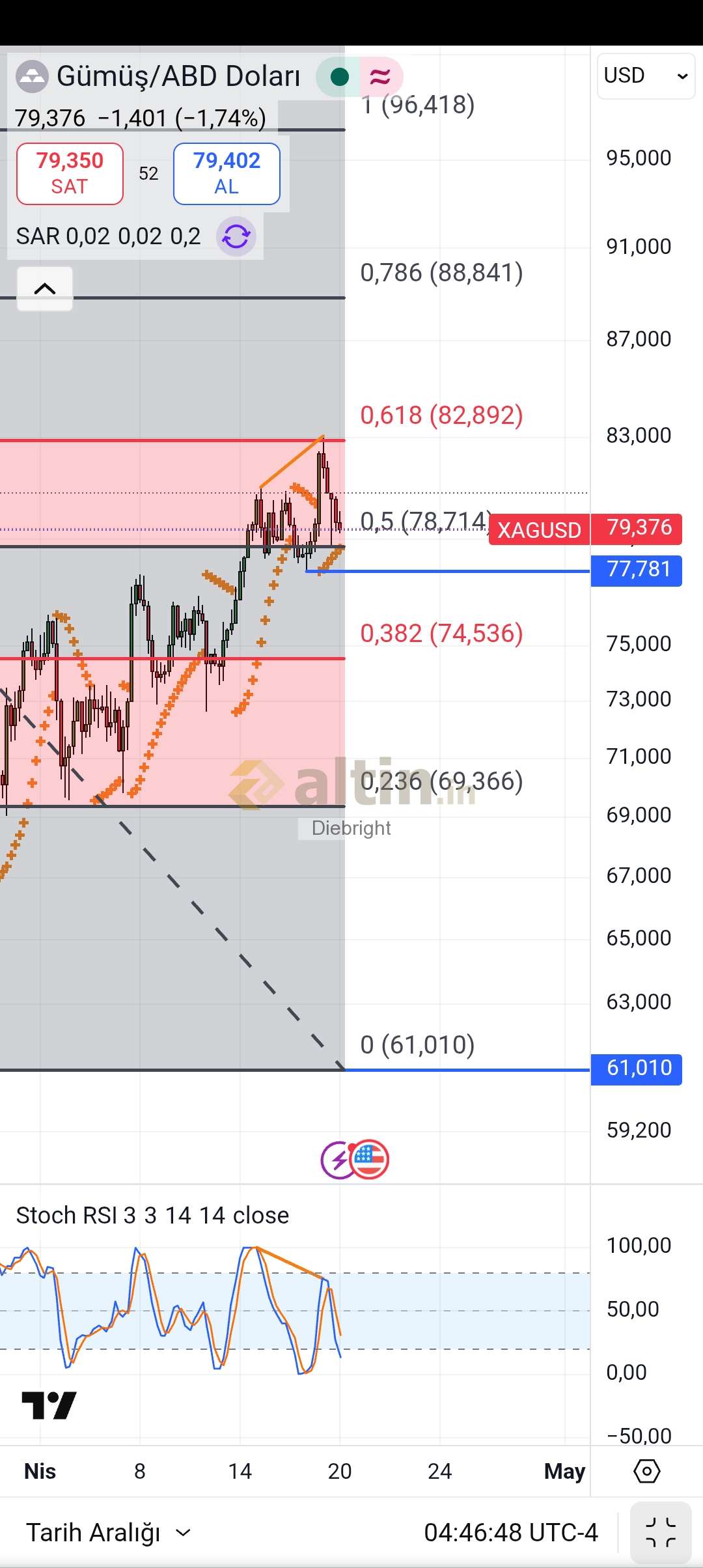 Beklemek yerine kâr aldım gecen cuma. Şimdilik doğru karar gorunuyor. 4 saatliği dip yaptırırlarsa güzel olur. Negatif uyumsuzluk tamamlanır. Şimdi 78.71 fibo hedefi gece tam tamına çalışmış. 82.89 fibo direnci de çalıştı gecen cuma. 83.06 usd görmüşüz. 15-16 centte yanılmış olalım. Ben günlük dip yapsa da alsak peşindeyim fakat uzun suredir günlük dip yapmiyor. 4 saatliği en azından dibe çekseler güzel olacak. Oradan bir giriş daha yapabilirim. 78.71 usd önemli bir altta önceki dip olan 77.78 usd de önemli. Cunku 61.01 usdden itibaren yükselen tepe ve dip yapiyor. 77.78 usd asagisina giderse bu yapı bir miktar bozulur. Orada ikili dip yapmaz ise aşağıya bir kirilim gelir. Gümüş al sat yapan icin güzel imkanlar vermeye devam edecektir. Alım yapacaklar etkilenmesin. Ben biraz daha düşüş bekliyorum diye düşecek değil. Ben 4 saatlik dip yapacak diye düşünüyorum diye dip yapacak durumu yok. Bir haber akışı olur dip yapmadan buradan yükselir gider 82.89 usdyi de kırar. Kademe kademe bakmak gerek. Elde iki yöne de imkan bulundurmak lazım.