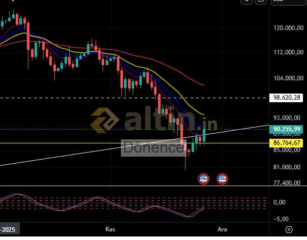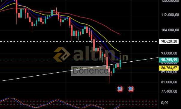 BTC burdan grafik de yer alan yatay kesik çizgiye kadar bir yükseliş gerçekleştirebilir yani 98-99 bin bandına kadar fakat asıl sorun şu bu çizginin üzerinde haftalık kapanış yapıp bunu diğer haftalarda devam ettirebilecek mi? Asıl mesele bu eğer bu şekilde 98-99 bin bandına gelip burda kesik çizgi Altın da yatay seyir izlerse sıkıntılar daha da artar.Sonuçta her seviyeden btc alan zaten kazanacak ama altların çoğu geçen senede söylediğim gibi çoğu dot- com balonu evresine girdi ve çöp olacak.Yani işin özeti temel olumlu aslında ama teknik iç açıcı değil.Sadece düşüncelerimi paylaşıyorum analizlerim kimseyi bağlamaz.Her analizin yanılma payı vardır.Bekleyip görelim.(Geçen hafta attığım grafiğin yakın çekim hali)