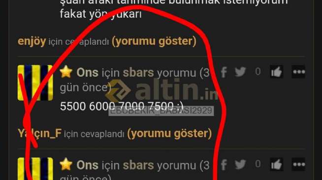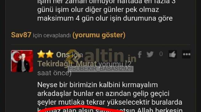 Ons için EBUBEKİR_BABASI2929 yorumu ()İşin ilginç yanı 46 lik oldukları kabul de etmiyorlar. sen git çarşıda en büyük kuyumculara toptan Altın sat. burda gms patronu gibi çocuklar, tekirdagli gibi çöpçüler sana laf söylesin:)