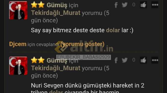 Ons için EBUBEKİR_BABASI2929 yorumu ()Bu tekirdagli yıllar a usd sayfasında 100 bekledi durdu. milleti batırdı. simdi onsculari . şimdi de gms sayfasına gitmiş.