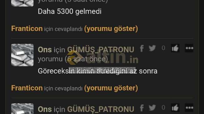 Ons için EBUBEKİR_BABASI2929 yorumu ()Şunu da söyleyeyim. Arkadaşlar 2 inci işimiz. ceyrek ve Cumhuriyet kg olarak çarşıda satıyoruz, soru şu dün niye ons 500 usd düştü?