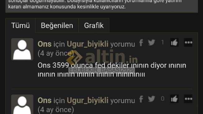 Ons için EBUBEKİR_BABASI2929 yorumu ()Kıymetli arkadaşlar ,3,4 sene önce ko nutta fu rya oldu. sonra araçta. Şimdi de Altın da. o zaman larda da fiyat hep yukarı gidecek zannediyordu insanlar. simdi altın içinde aynısı geçerli. bir yerden dönecek. sonrq senelerce yatay ve düşüş (ons olarak söylüyorum).