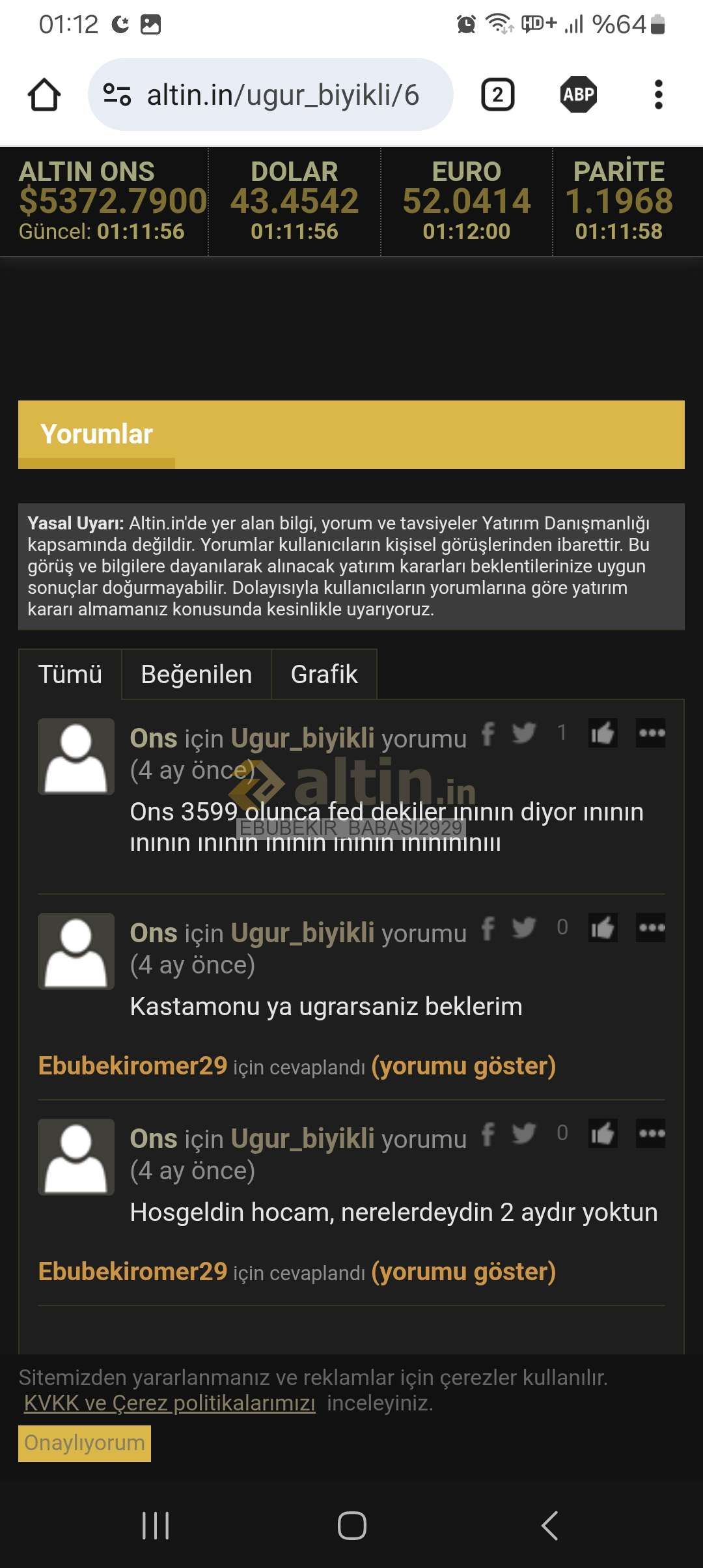Ons için EBUBEKİR_BABASI2929 yorumu ()Sitenin yarısı engelli ve bu arkadaş lar bizim yüzümüzden zarar etmiş. Kör mü çevrimdışı yorumlarımı okumasaydin. kime al veya sat dedik. kendi yaptığım işlemi yazdım.
