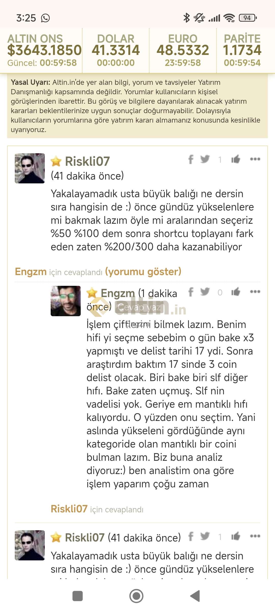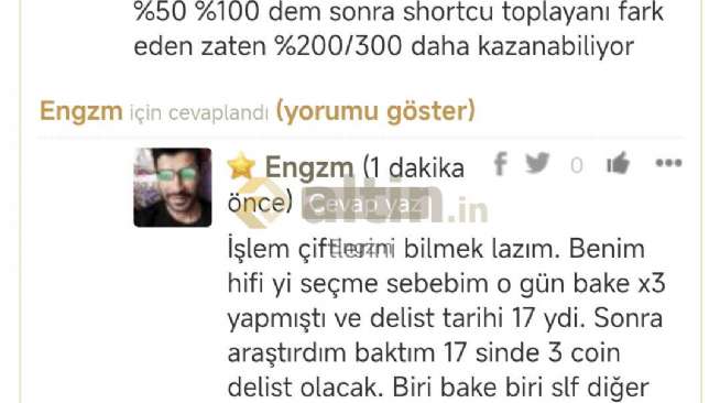 Bitcoin için Engzm yorumu ()Dedik ya burda aldık diye. Ayrıca Şahmeran a da söyledim x8 alacağım diye. Onun dışında sana zaten şahsi olarak 2 coin vermiştim ama degerlendirmedin. Risk almak istiyorsan vereyim coin. Ama paranın çoğunu kaybetme olasılığın var. Bunu kabul ediyorsan bake al Yarım dolar olunca sat