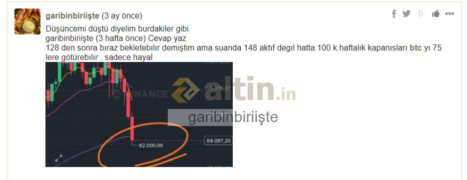 KIK9GY (24 dakika önce)15 k da btc alan azdı. Alt coin alan çok oldu. Alt coinler 2x 3x yaptı . 30 kat düşmüş zararda olan kişiler az yükseldi diye satmadı satamadı. Btc yükseldi yani. bu saatte sonra kimse neyin yükselip yükselmeyebeğine bakmaz kendi adıma 1 kuruş koymam... kaç aydır altın alırım.. fiziki.. düşsün kalksın en azından dolandırılmıyorum. bataklık..