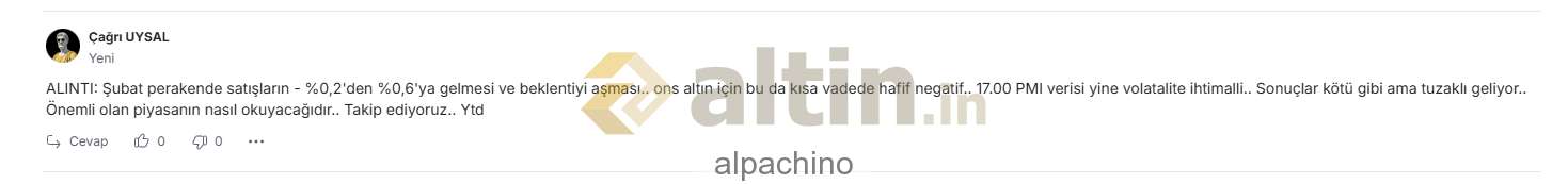 Ottoman06 (9 dakika önce)Az önce gelen veri "Altın için kısa vadeli bir negatif baskı" yarattı. Petrol eğer 87 doların üzerindeyse altındaki bu baskı biraz daha sancılı geçebilir.