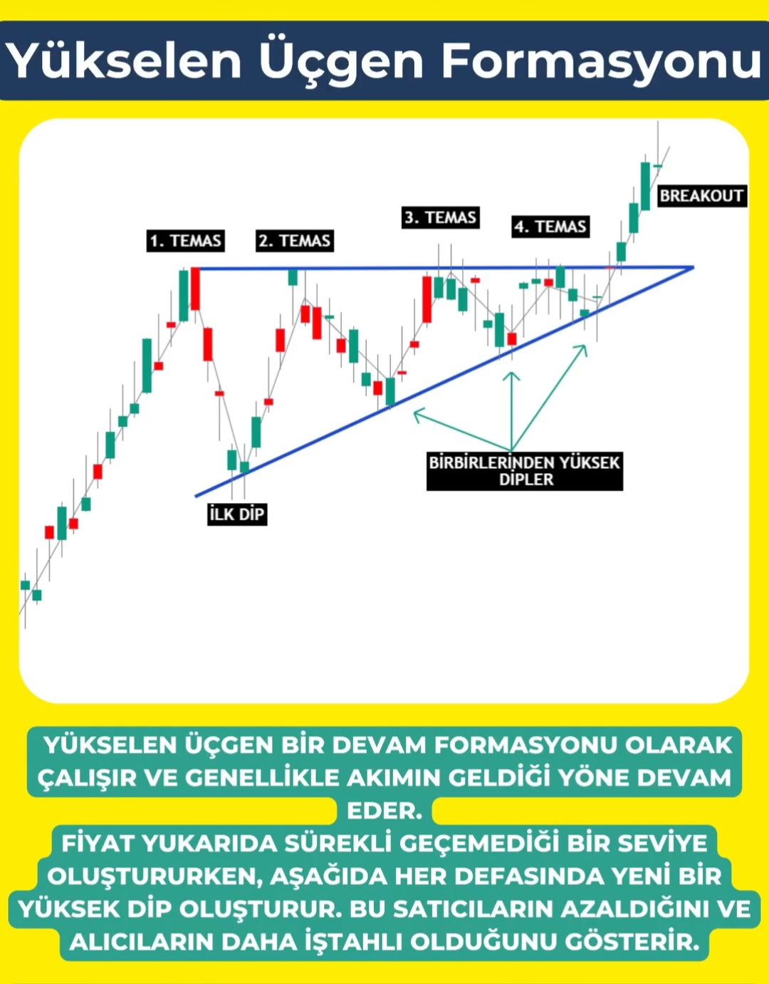 Yükselen üçgen formasyonuna Ons altın grafiğinde Nisan Ağustos sonuna kadar olan konsolidasyonunu örnek olarak ele alırsak 1.yükselen dipler üçgen sonuna kadar dantel gibi dizilen mumlar ve temel taraftan gelen j.hole toplantısından fed sinyaliyle formasyonun hangi yöne kırılacağına (ayılarmı boğalarmı) yönünde ip uçlarıyla güzel bir eğitim çalışması tadında izlenebilir