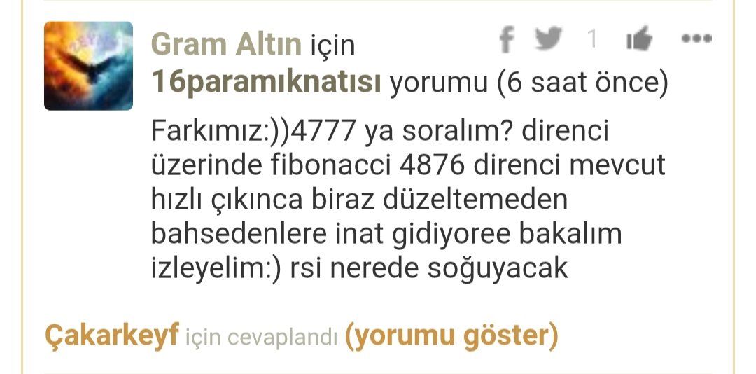 Saraylıo (9 dakika önce)Altın şuan düşüş sonrası son zirvesinde ben aynı fikirde değilim. Haftaya düşüş başlayacağını düşünüyorum. Şahsi analizimdir yaşayıp göreceğiz. ytd
