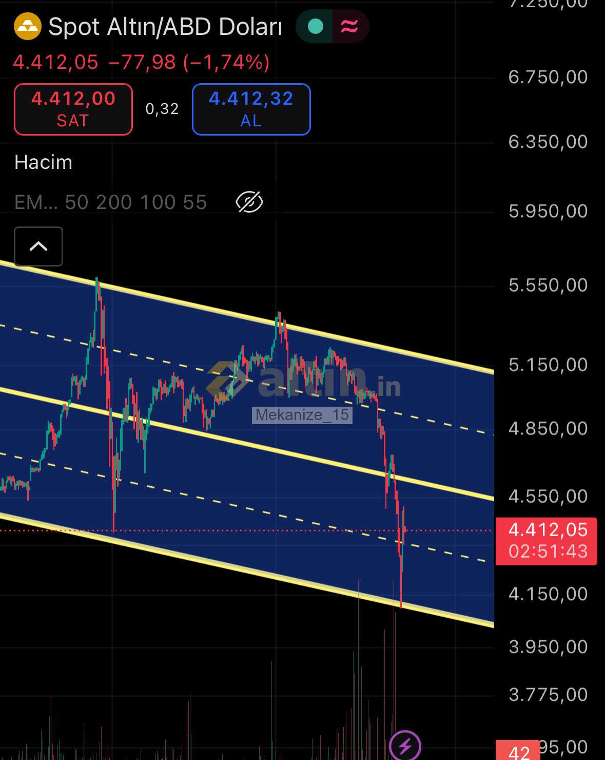 200 günlük 4.100 seviyelerinde destek bulan ons altın, şimdilik kısa vadede toparlanmaya çalışıyor. Ancak yukarı yönlü henüz güçlü bir sinyal oluşmuş değil. Tabi şu aralar çizgiler destek direnç fayda etmiyor 5500 olsada şaşırmam 3500 olsada.