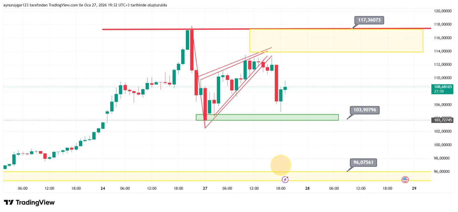 Aşağı kırılımda: 103.90 ve 96.07 seviyeleri sırayla test edilebilir.