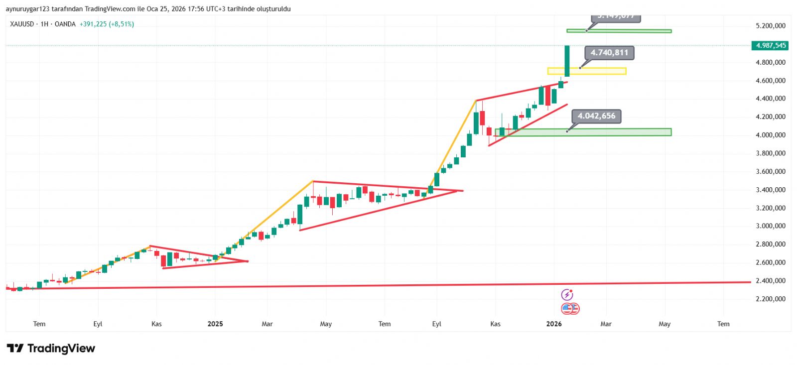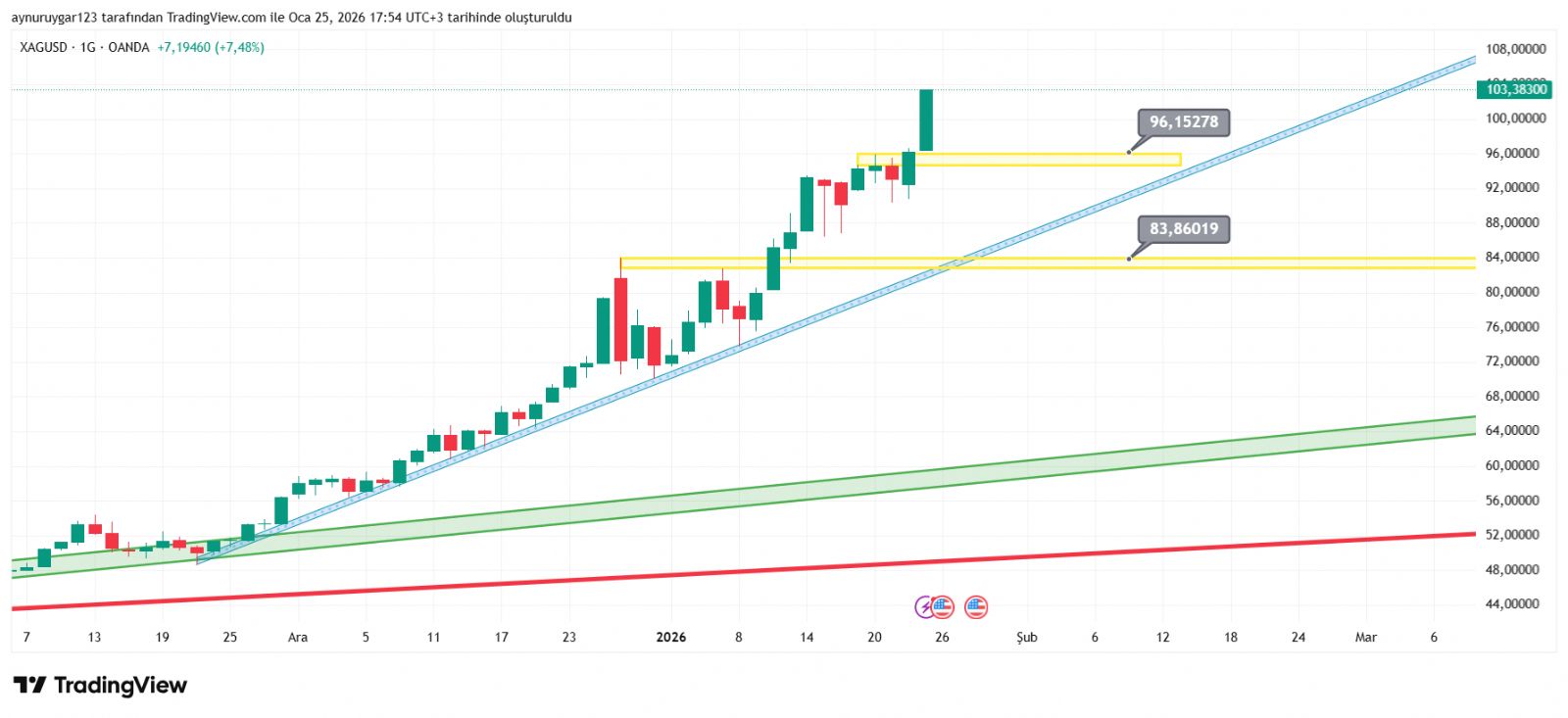Farketmiyor musunuz, günlük 4 5 dolar hareketler var gümüşün boğası çok güçlü trend çok kuvvetli arz, açığı çok fazla 50 yılın acısını çıkartıyor. Türev piyasalarda jp Morgan gibi bankalar short pozisyonları kapatmak zorunda kaldılar çok büyük zararlar yazdılar longa geçmek zorunda kaldılar burdan 500 dolara gitse şaşırmam ha bu süreç 2 sene sürebilir
