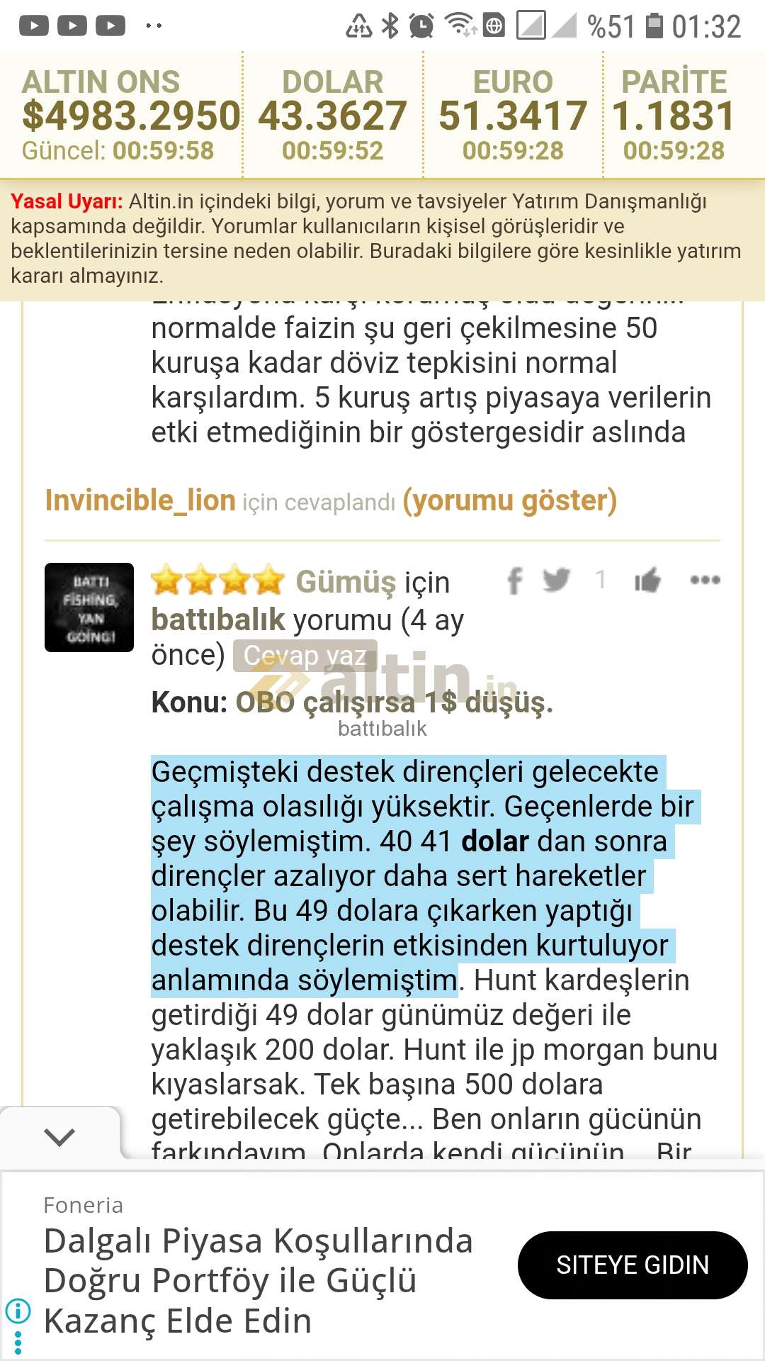 battıbalık (3 saat önce)@REŞAT12 Ben öyle bir şey söylemedim. 13.6 dolarken 120 dolar hedefinden bahsettim. Aynı şekilde 1236 dolarken altın ons 2100 gibi hedeflerden bahsettim. 1650 dolarken 4000 dolar hedefinin olduğunu söyledim. Gümüş 1 ayda %45 civarı tl bazında fiyat artışı oldu. Zarar yazmadı gümüş . Hatta 40 dolarken sert hareketlerin geleceğini söyledim.