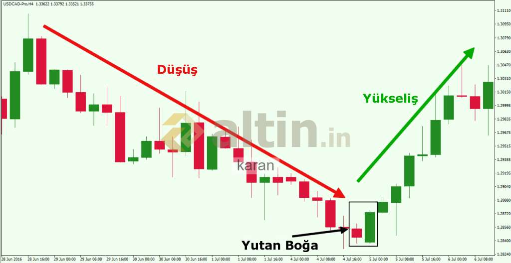 Dönüş formasyonu oluşması için örnekteki gibi art arda yeşil mum gerekli. Tek günlükler yetersiz
