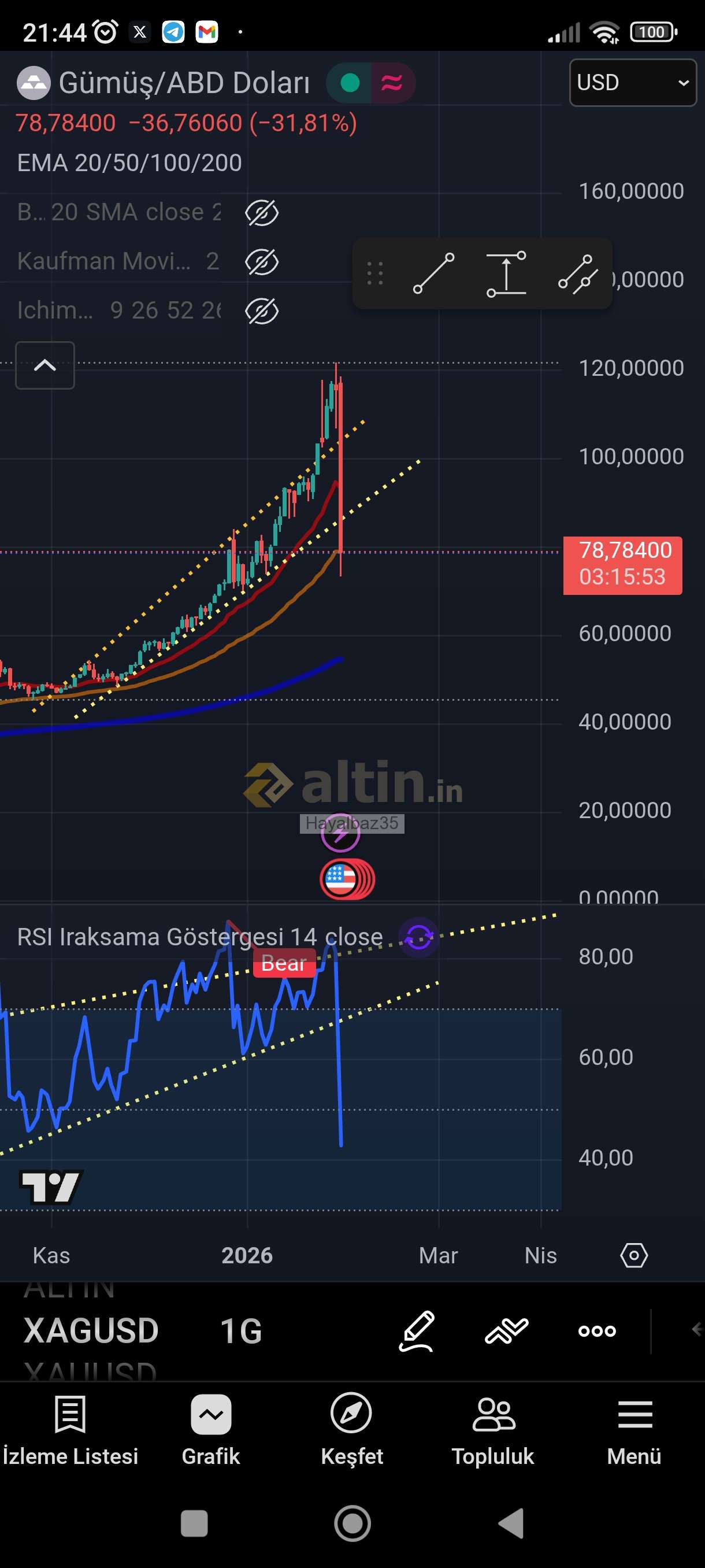 Gümüş için Hayalbaz35 yorumu ()85 dolar altı kapanıs tepki yükselişi dostlar