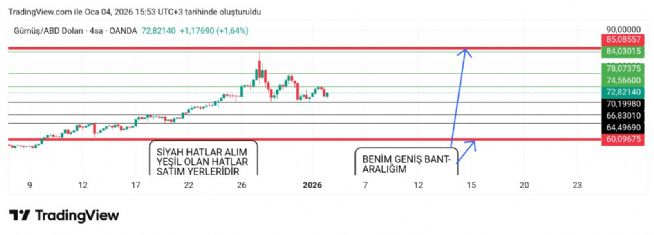 Gümüş için Hayalet_adam yorumu ()Grafiğin bulunduğu alana göre gün içinde veya birkaç gün içinde altta veya üstte nerelere uğrar bunları yazarız isteyen olursa sorun değil kardeşim. Hareketin yönünü yazmakla bu dediğimiz şeyi yapmak ayrı şeylerdir ama talep olursa bunları yazmak zor birşey değil benim için. Misal 70 ten 71 den alım yapmış olan bir kişi için üstte kademe yerleri 74 75 bir kademe 77 78 civarı da bir kademe daha satış mümkün olur. Aynı kişi için geri inişte alttan 68 ve 64 65 gibi bir noktadan da 2 kademe alım yapmak mümkün olur. Benim normal takipte ise kademe 2 yeri 64 64 tir ara bölgeleri yazmadım orada. Aralığı daha dar tutanlar için 68 veya buraya yakın bir noktada olabilir bunu da eklesin bu dediğim şekilde yapanlar. Hatta örnek bir grafik te paylaşabilirim bununla ilgili.