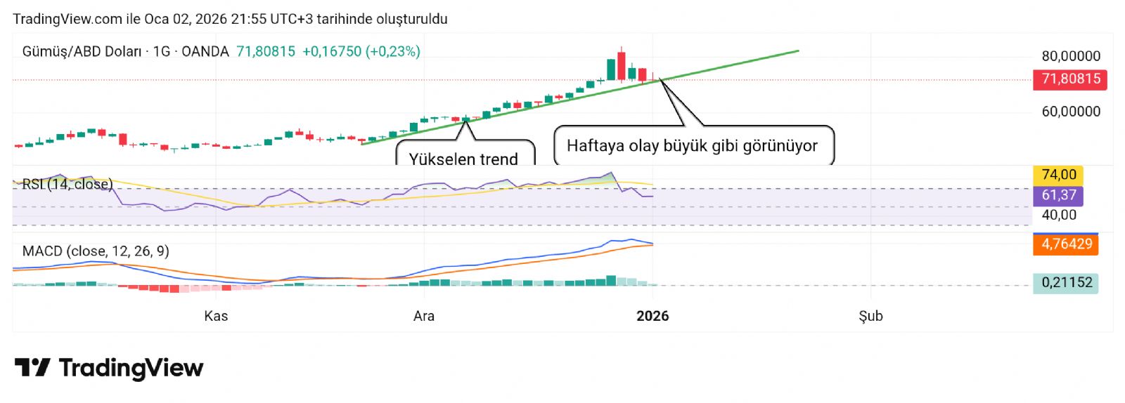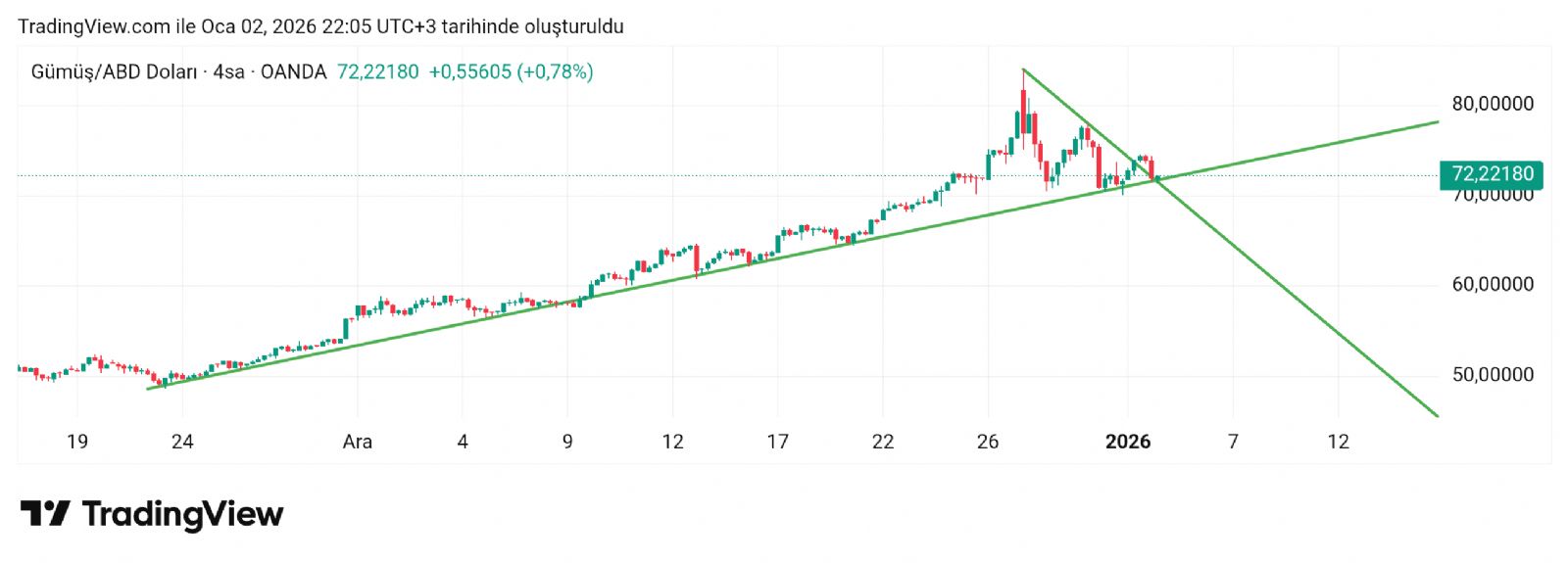 Gümüş için Hayalet_adam yorumu ()72.70 dediğim yer dirençti aşamadı tekrar indi aynı hatta. Şuan tam destek hattında bakalım ne yapacak. Diyorum ya baskı alta doğru o yüzden destekte sadece bir parça denemelik olabilir daha altı için hazırlıklı olmak lazım.