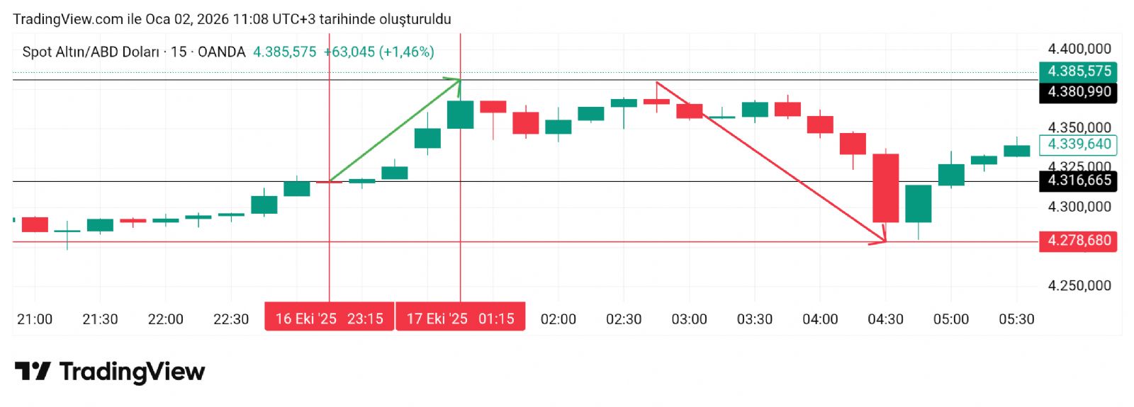 Şimdilerde meşhur destek direnç olarak paylaşılan 4380 noktası. Grafikte henüz buraya gelmeden 431x lerde yaptığım 4380 direnç paylaşımı ve sonrasında yediği sert satış ile 4278 e indiği zamanlar. O tarihte orada bir direnç olacağı kimin aklına gelirdi acaba? :) oradan sonra oluşan nokta şimdi meşhur oldu. :)