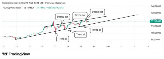 Gümüş için Hayalet_adam yorumu ()90 dan sonra oluşan trendi en baştan takibe aldım geriye her inişte trend takip ettim ekleme yeri dedim üste çıkınca satış şartıyla dedim. Sırasıyla bu inişlerde destekler şunlar oldu hepsini de yazdım noktasal. 102-105-110 bunlardan ekleme dedim üstte satış dedim dirençte ve sadece burada bile 3 tur attık.