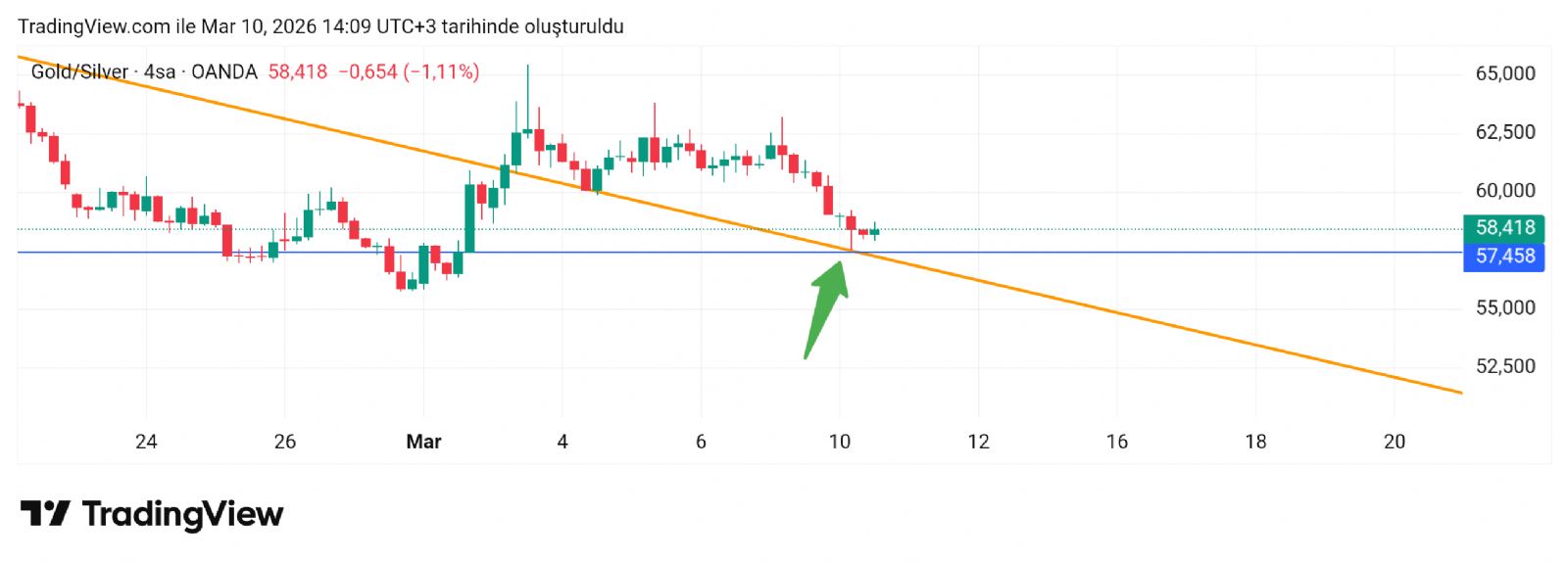 İşaret edilen yere noktasal temas ile destek almıştır. Ons gümüş akşam yazdığım yerden satış yemiştir buradaki duruma göre. Şimdi önce 60 denemeleri yapar sonra daha üste atar diye düşünüyorum arkadaşlar. Buda ons gümüşte tekrar alım fırsatı demektir. Takip edildiği şekilde devam ediyor sıkıntı yok şuan.