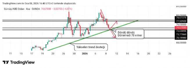 Gümüş için Hayalet_adam yorumu ()73.5-7 ile 74.6 civarı destek olabilir grafikte gösterdim. Buradan destek alırsa eğer 77.55 78.07 ye kadar tepki gelebilir İlk olarak. Destek direnç arası ufak al sat olabilir deneme olarak tercihe bağlı olarak. Dediğim gibi bu destek tutamazsa eğer 70 e kadar iner grafik yatay destek noktasına. Tepeden satanlar için denemelik yerlerdir ufak denemeler olarak.