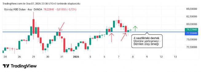 Üzerine yerleşirse destek olur yoluna devam eder denilen olaya bir örnek. 4 saatlik grafik 77.55 desteği.