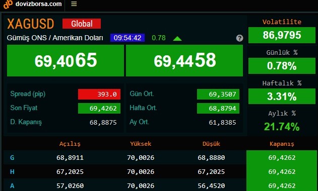 Gümüş için HÜMANİST_ yorumu ()70,01 değil de 70,002 gören gümüş ons özelinde olası 70 üzeri hedefi 74,25 ( 74,72 ) beklenebilir. günlük alım rakamlarımdan bağımsız olarak trendsel en önemli alım rakamı ise 70,002 tepesine göre 65,75 olarak görünmektedir. tamamen hayal ürünüdür